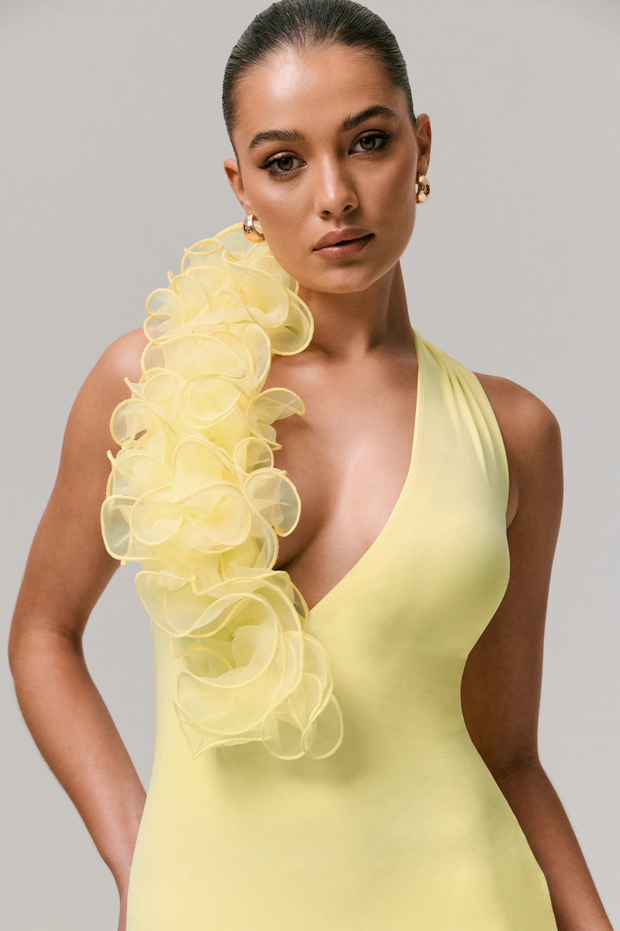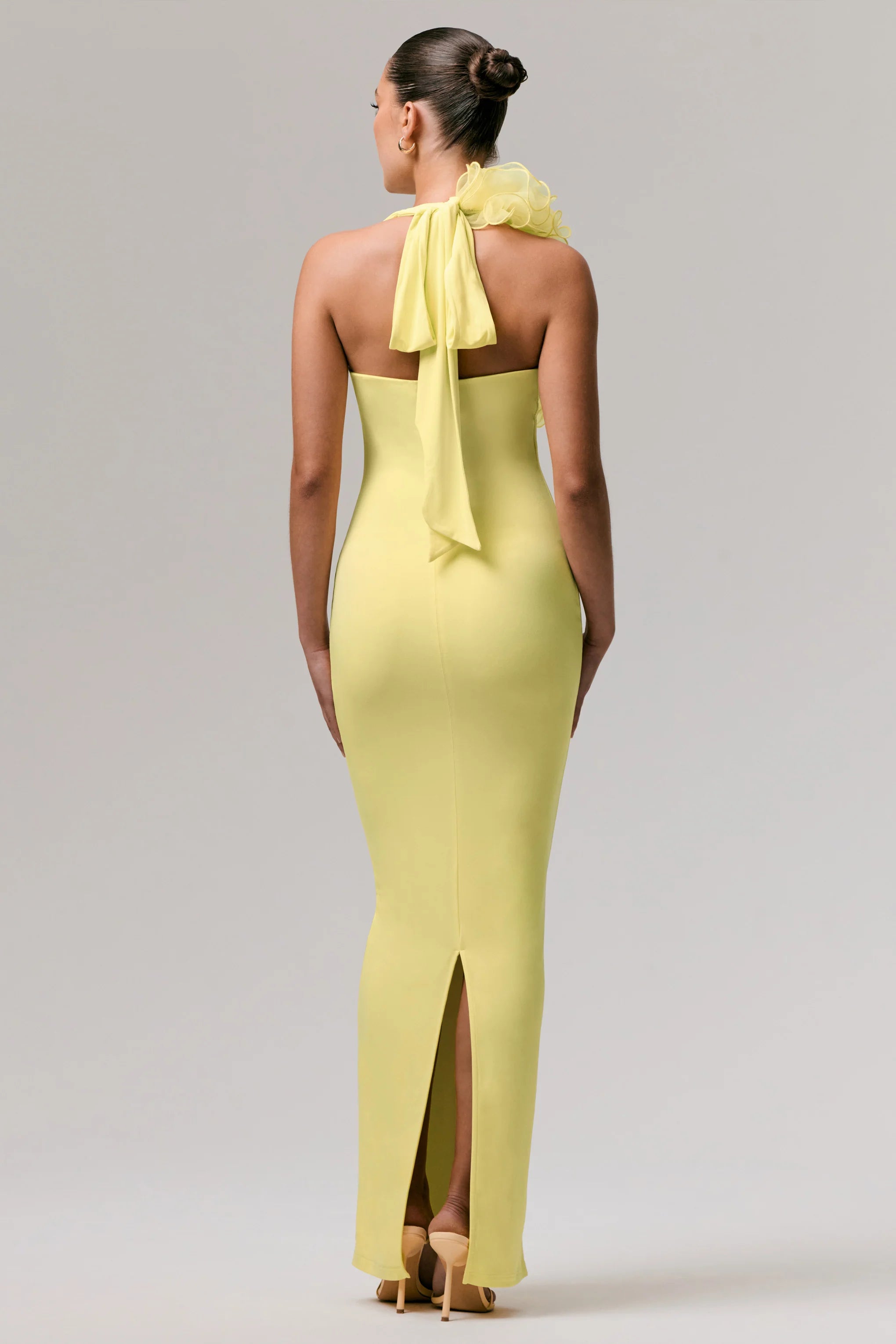 Radiate elegant femininity in our Harriet maxi. Curated in a soft lemon hue of our sleek premium stretch jersey, this gown contours all your curves and sculpts you beautifully. Finished with a daring, extreme-plunge neckline that is complimented with a delicate floral detail. The functional neck tie not only ensures a perfect fit, but adds a statement bow detail at the back. Harriet is perfect for any occasion where you want to stand out.