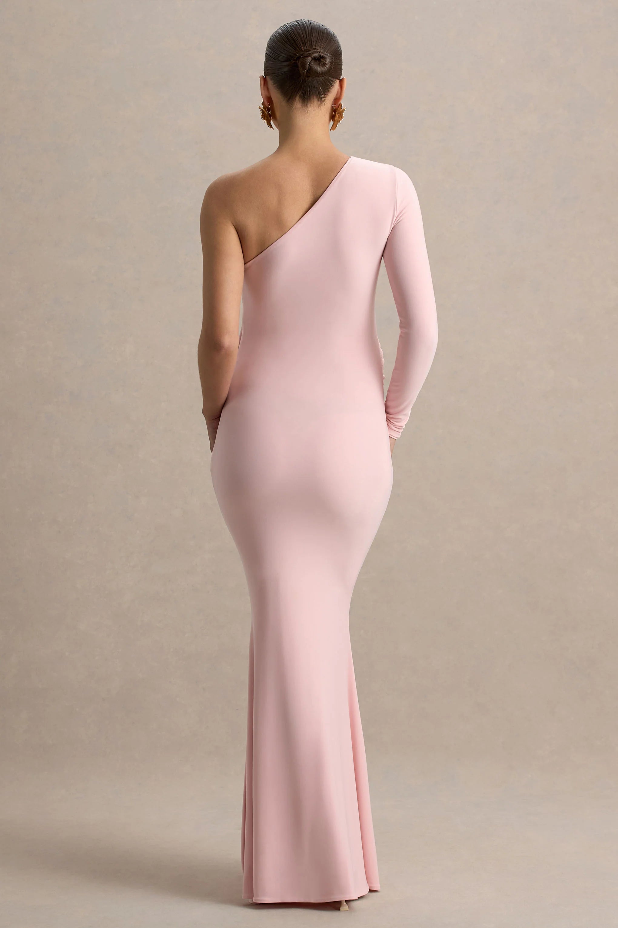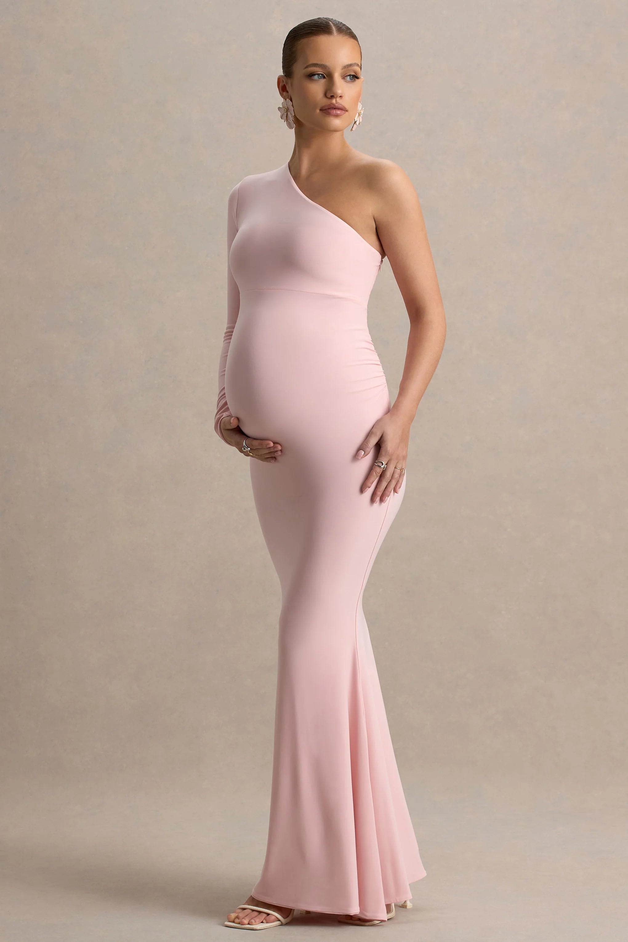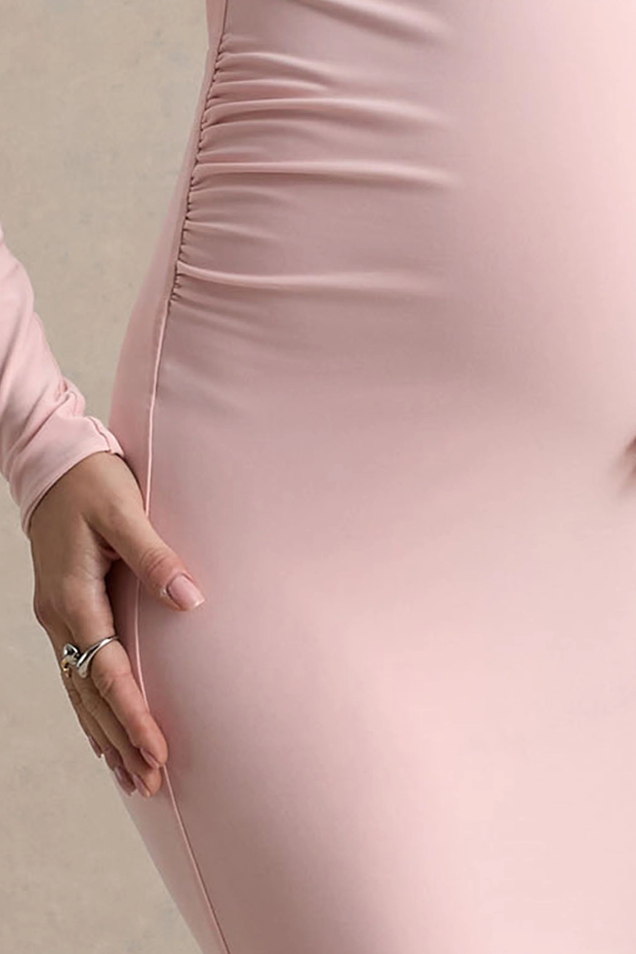 From baby showers to weddings, Heloise will be your go-to for any dressed up moment. Curated in a soft pink shade of our premium stretch jersey, this dress not only sculpts your figure but provides utter comfort. The asymmetric neckline delicately highlights your decolletage, adding a touch of elegant femininity. Style with gold accessories and impress any room you walk in.