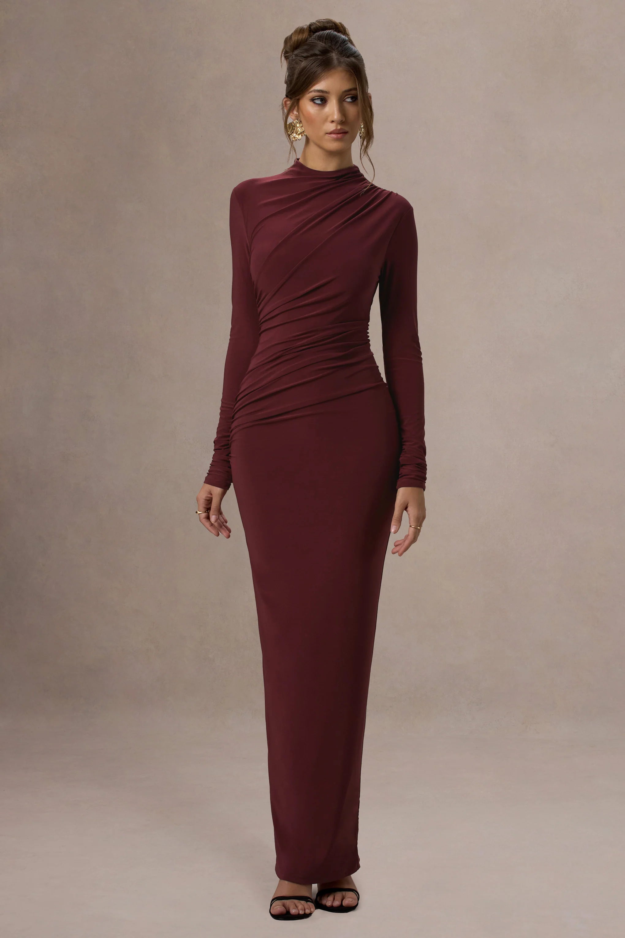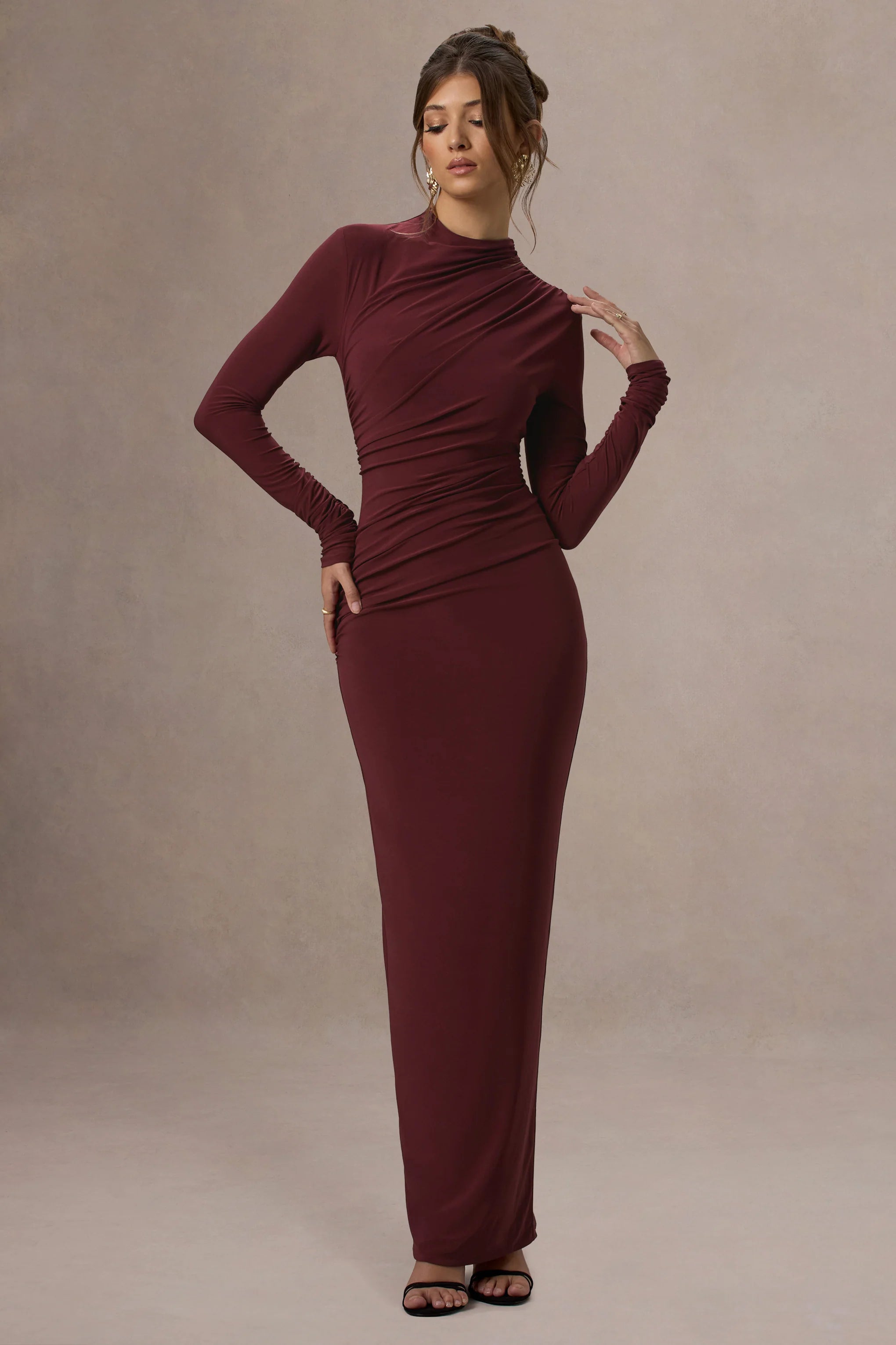 Framing your figure in a sculpting silhouette of dual-layered jersey, Hespera is as flattering as it is flawless. Arriving in a rich port hue, this maxi dress is detailed by a demure high neckline, long sleeves and strategically placed ruching to enhance your natural curves. Complete your look with some complimenting gold accents like Ishani.