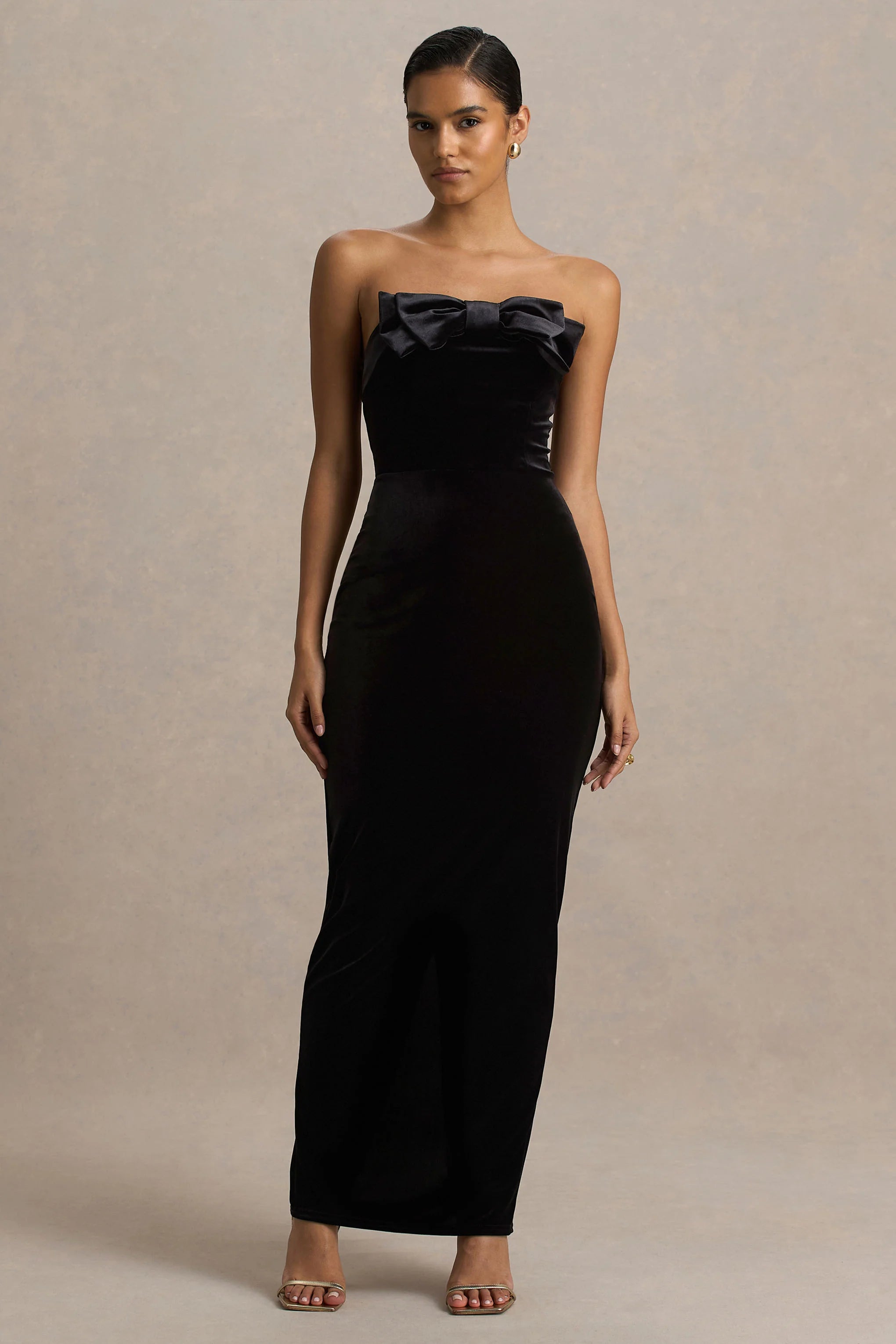 Turn heads in Illusion, a piece designed to captivate from every angle. Crafted from our premium black velvet, this maxi hugs your curves luxuriously for a sleek, sophisticated finish. The bandeau neckline is finished with a statement bow, adding a touch of playful elegance, while the open back and centre-back split create a striking, confident silhouette. Perfect for evening events or occasions that demand a lasting impression, Illusion is the ultimate choice for effortless glamour.