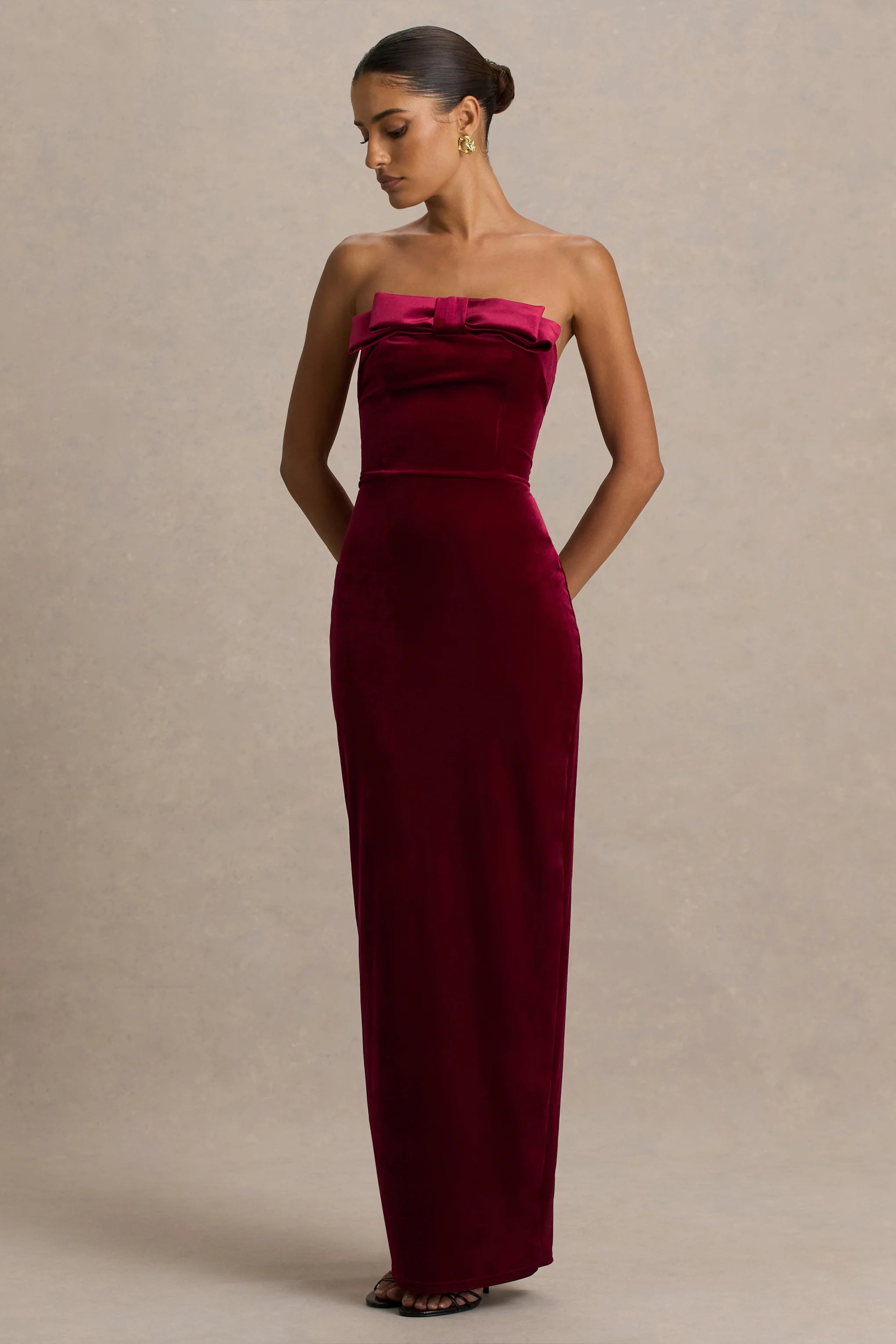 Turn heads in Illusion, a piece designed to captivate from every angle. Crafted from our premium burgundy velvet, this maxi hugs your curves luxuriously for a sleek, sophisticated finish. The bandeau neckline is finished with a statement bow, adding a touch of playful elegance, while the open back and centre-back split create a striking, confident silhouette. Perfect for evening events or occasions that demand a lasting impression, Illusion is the ultimate choice for effortless glamour.