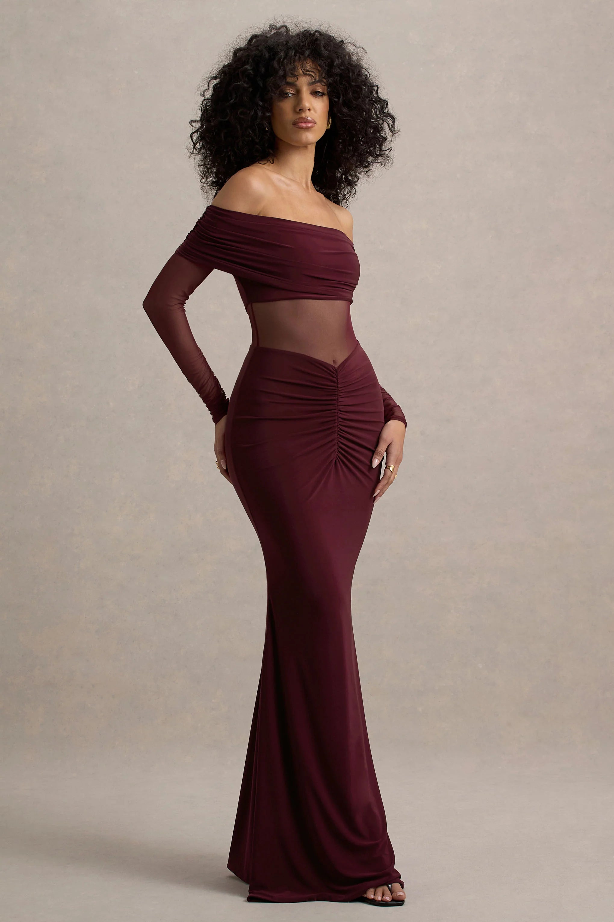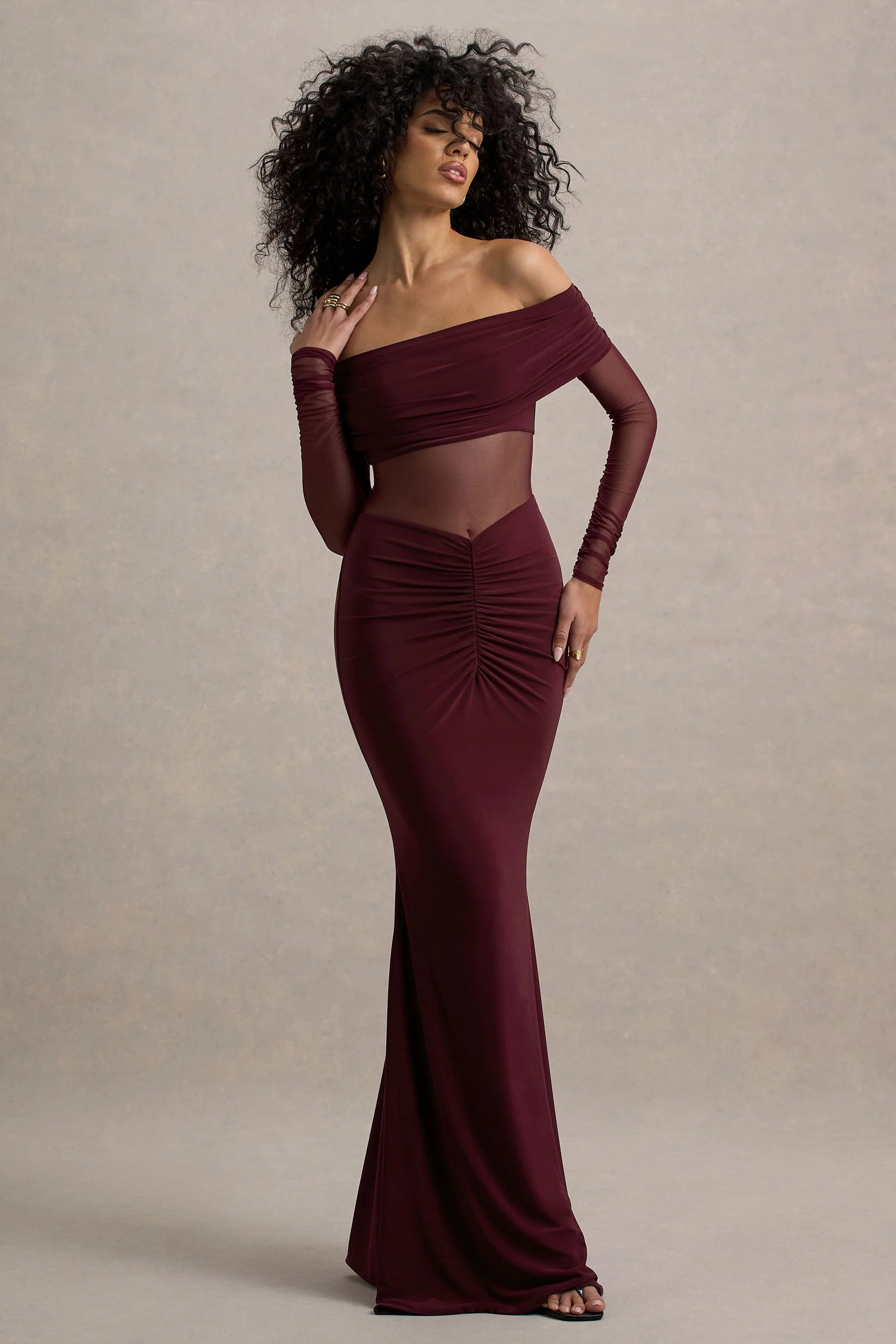 Whether you're attending a black tie gala or your own prom night, Ismeralda is a captivating choice. Carefully designed in our premium stretch jersey, this burgundy maxi dress boasts a bardot neckline, long sheer sleeves and waist-cinching ruching.