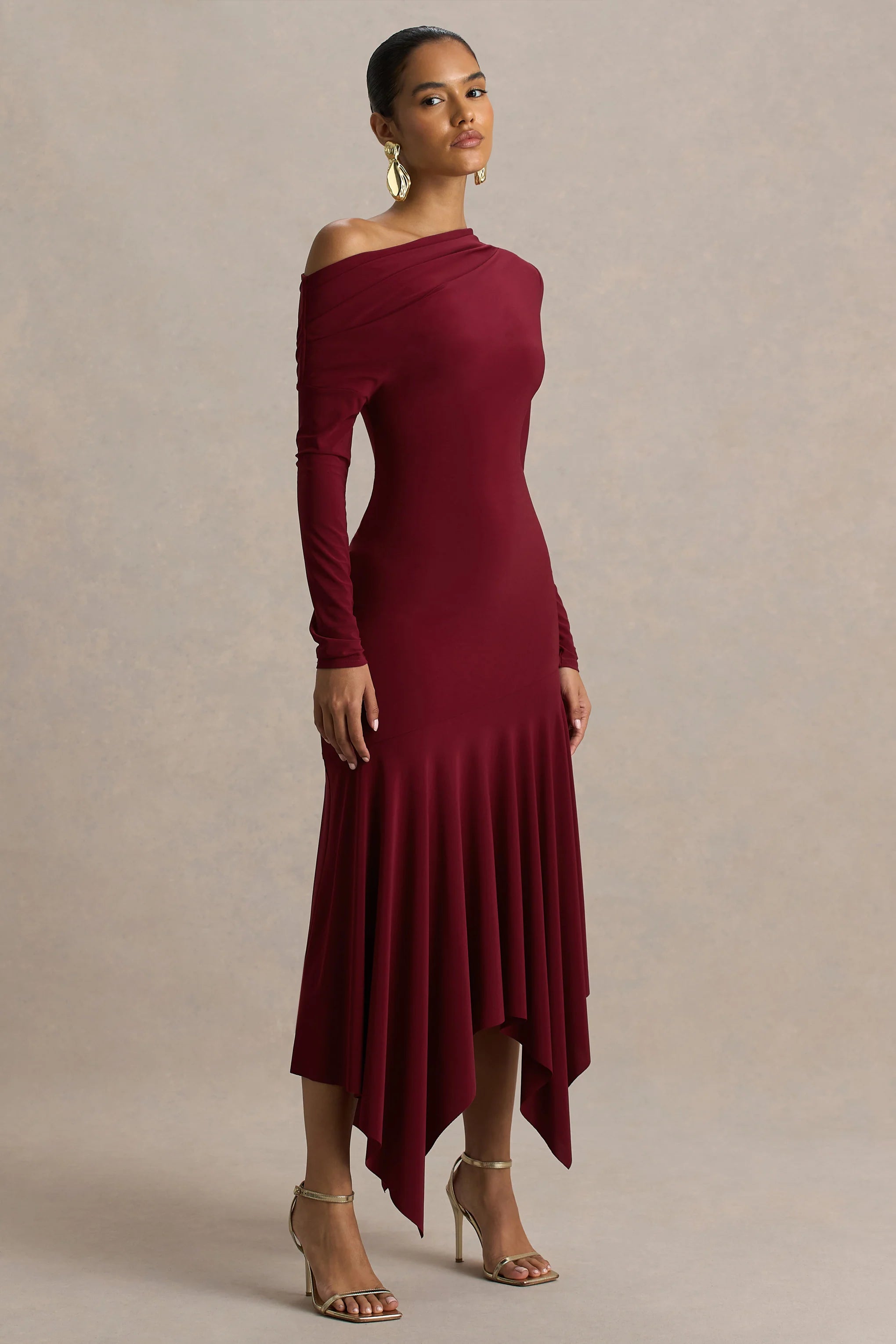 Introducing Isola, where sleek sophistication meets modern edge. Cut from our premium stretch jersey in a timeless burgundy, this striking midi dress is designed to move with you and flatter every curve. The asymmetric neckline and drop-waist silhouette create a unique shape, while the flowing hanky hemline adds soft drama and effortless elegance. Isola is your go-to for standout evenings and chic occasions.