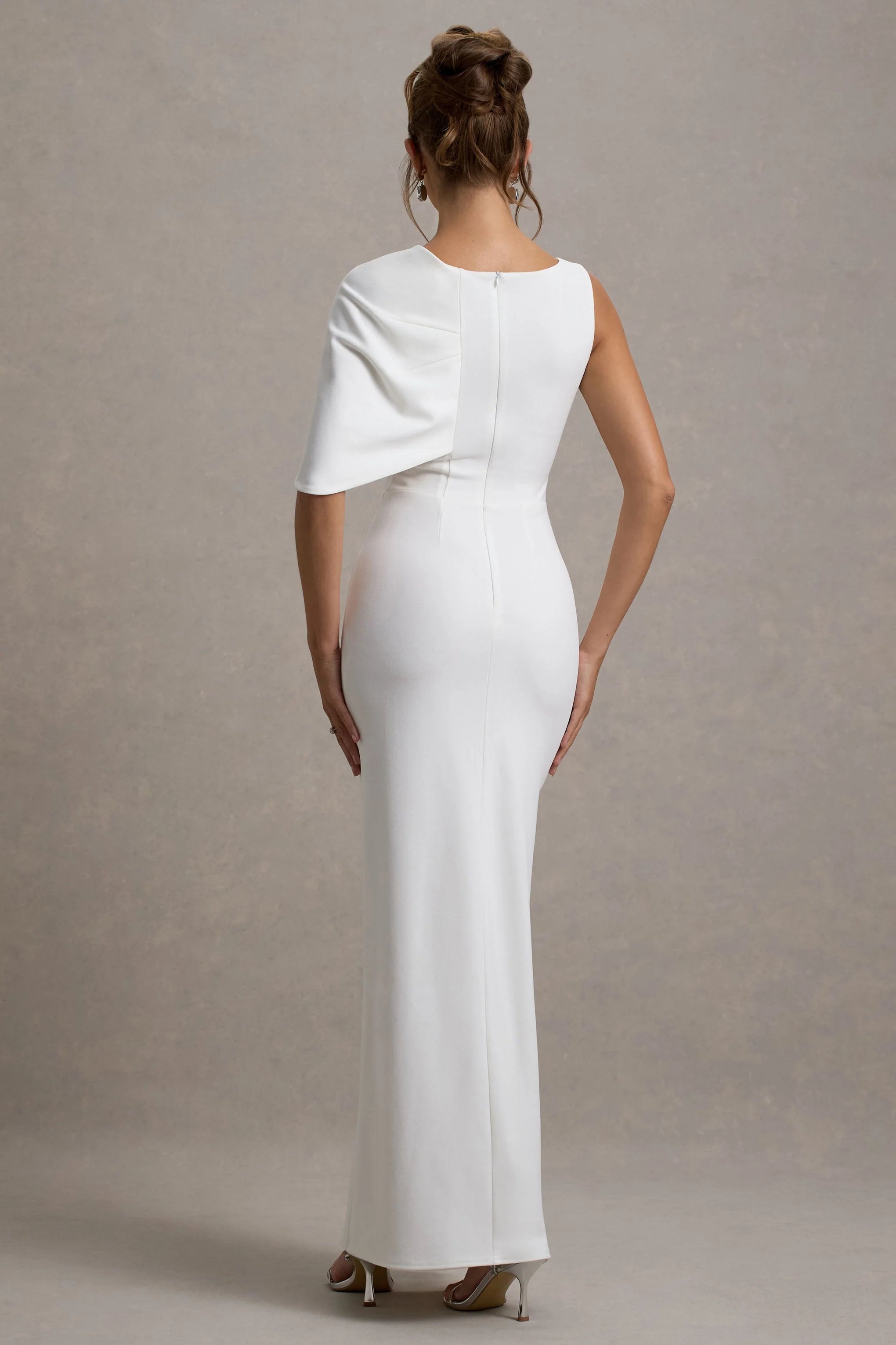 Make a lasting impression with Jamela, a striking one-sleeve maxi dress that exudes contemporary elegance. Crafted from our premium scuba crepe in white, this dress features a sleek, asymmetrical design that commands attention. Perfect for glamorous events, Jamela pairs beautifully with metallic heels and statement accessories for a show-stopping finish.