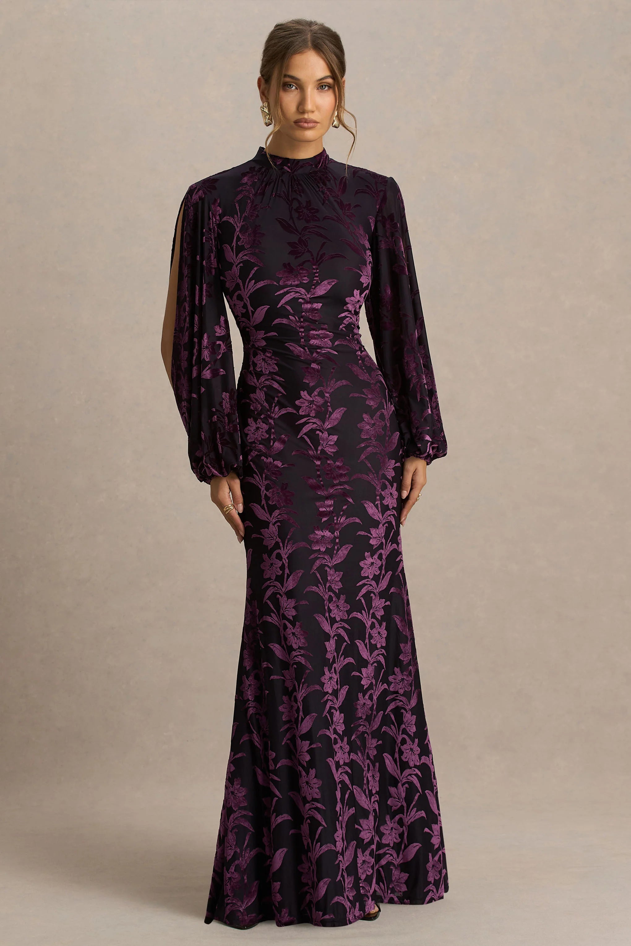 A statement of sophistication with a daring twist, Janet is designed for head-turning entrances. Crafted from our premium devore in striking black and rust, this maxi dress offers drama and refinement in equal measure. The high neckline creates a sleek, polished finish, while cold-shoulder styling and intricate cut-out detailing along the sleeves add unexpected allure. A true show stopper for occasions that demand impact.