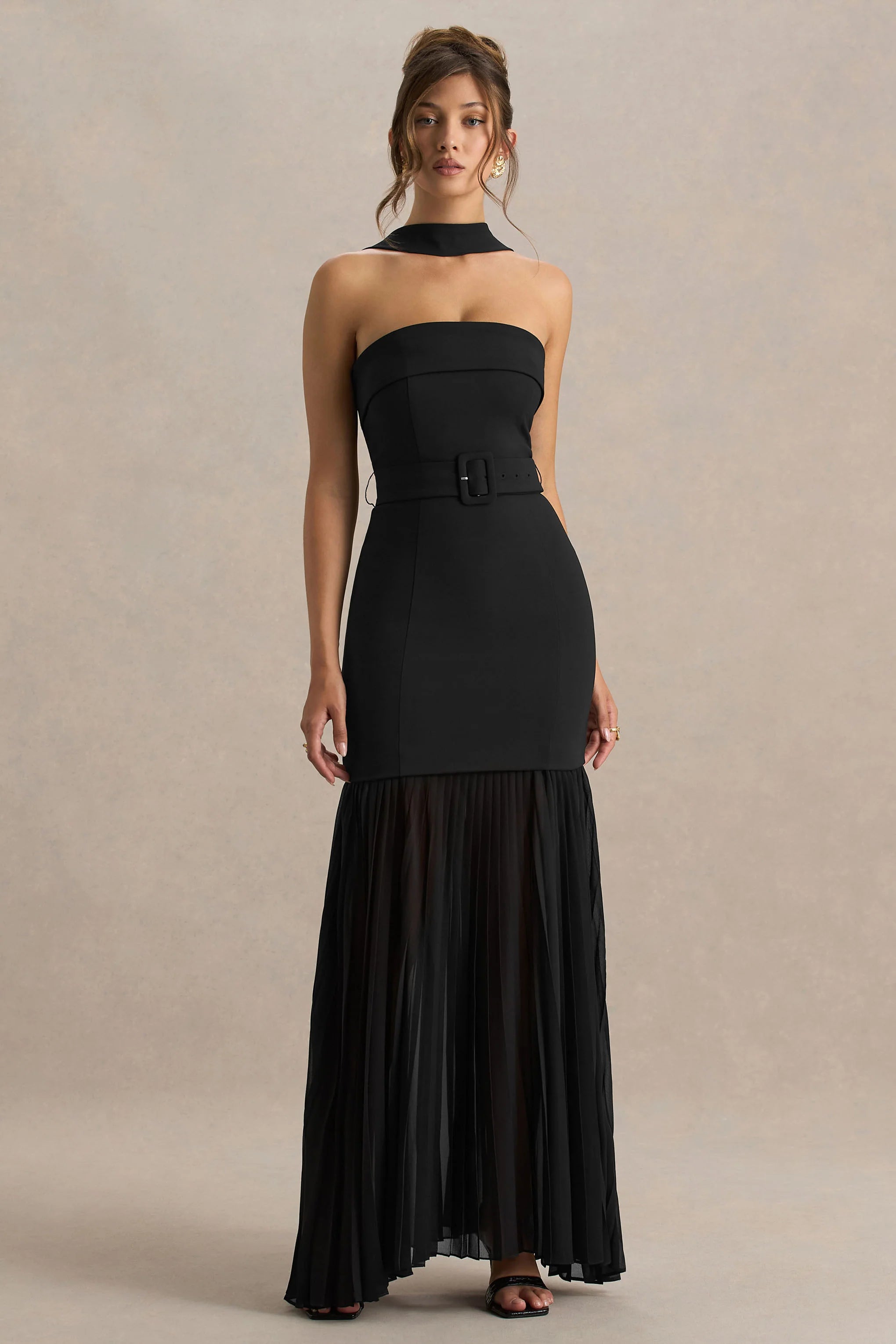 Make an unforgettable entrance in our Jaquetta maxi, the epitome of modern elegance. Designed in a bold black shade of our premium crepe and finished with a sheer, chiffon skirt for a striking edge. Featuring a choker detail that effortlessly enhances this timeless silhouette, as well as a chic folded bandeau neckline that provides delicate structure. Not only does this gown sculpt your curves seamlessly, the belt detail ensures you are cinched and flattered from all angles. Finished with a delicate, pleated chiffon skirt that moves elegantly will every gesture, this maxi is one you wont be forgotten in.