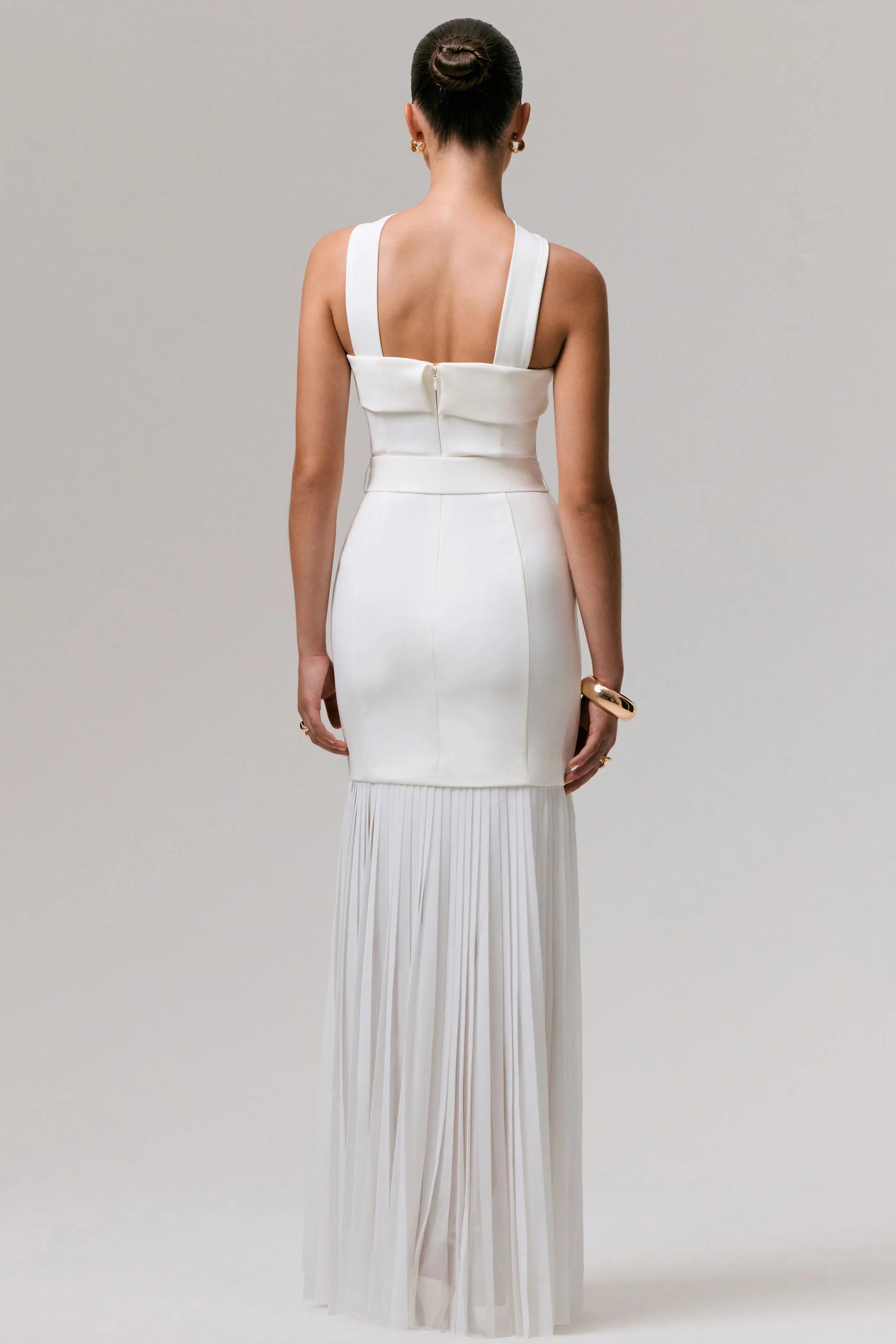 Make an unforgettable entrance in our Jaquetta maxi, the epitome of modern elegance. Designed in a bold white shade of our premium crepe and finished with a sheer, chiffon skirt for a striking edge. Featuring a choker detail that effortlessly enhances this timeless silhouette, as well as a chic folded bandeau neckline that provides delicate structure. Not only does this gown sculpt your curves seamlessly, the belt detail ensures you are cinched and flattered from all angles. Finished with a delicate, pleated chiffon skirt that moves elegantly will every gesture, this maxi is one you wont be forgotten in.