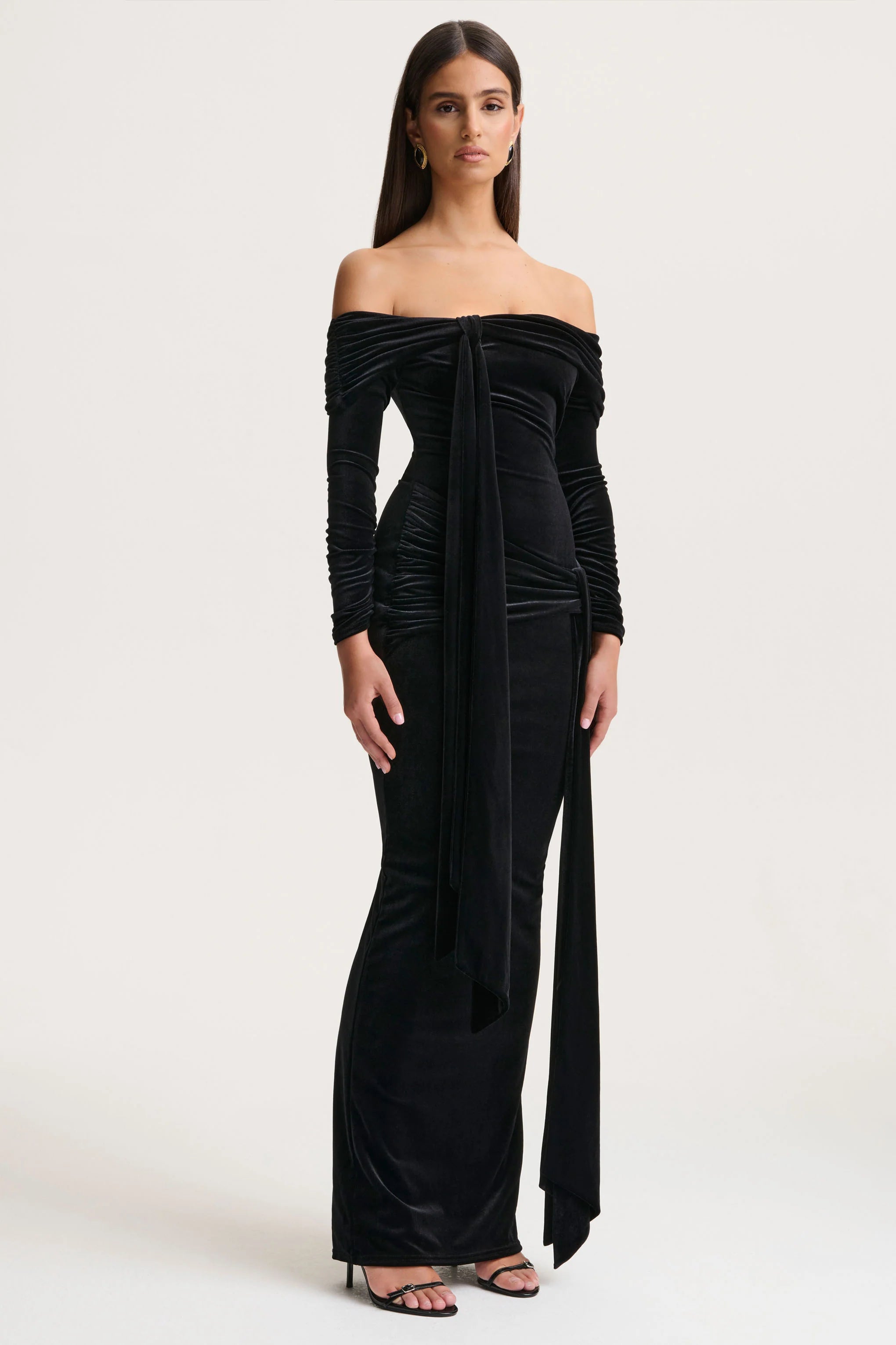 Jessara exudes contemporary elegance with a feminine silhouette. Crafted from our premium stretch jersey in classic black, this maxi-length design drapes effortlessly, enhancing every curve with refined ease. The bardot neckline frames the shoulders with understated allure, while delicate knot and sash details create a sophisticated, sculpted focal point. Finished with a flowing hem for graceful movement, Jessara is designed for moments that demand confidence, poise, and timeless glamour.