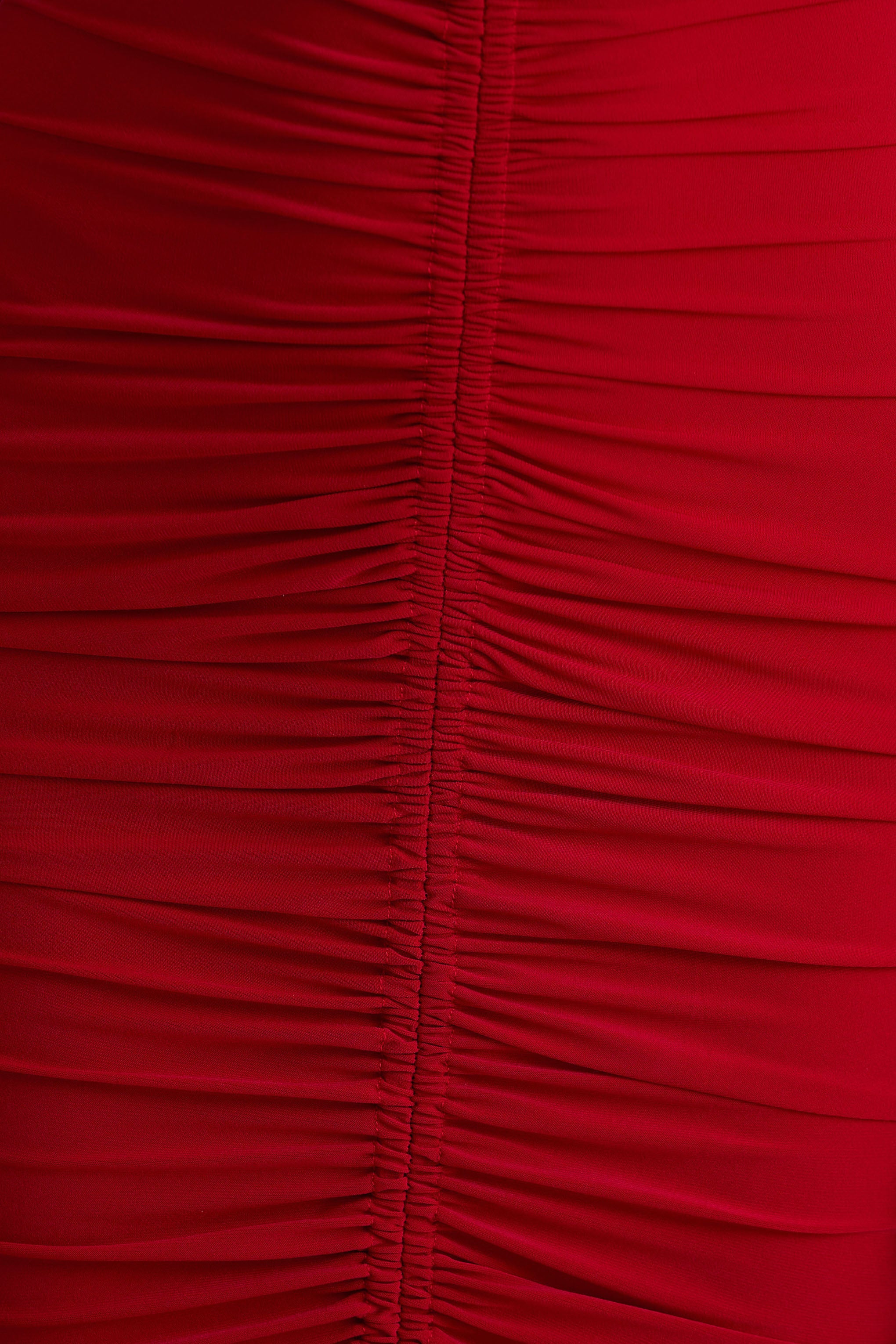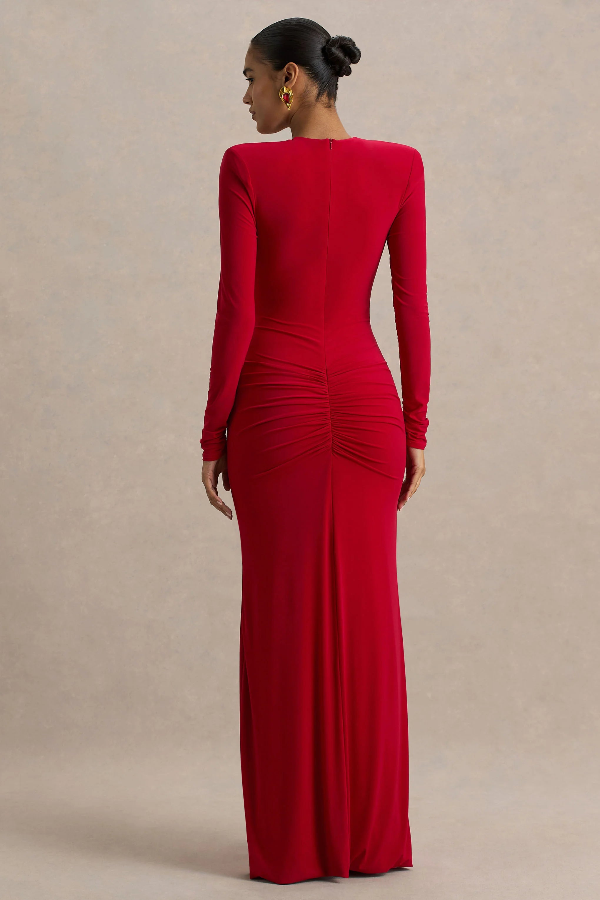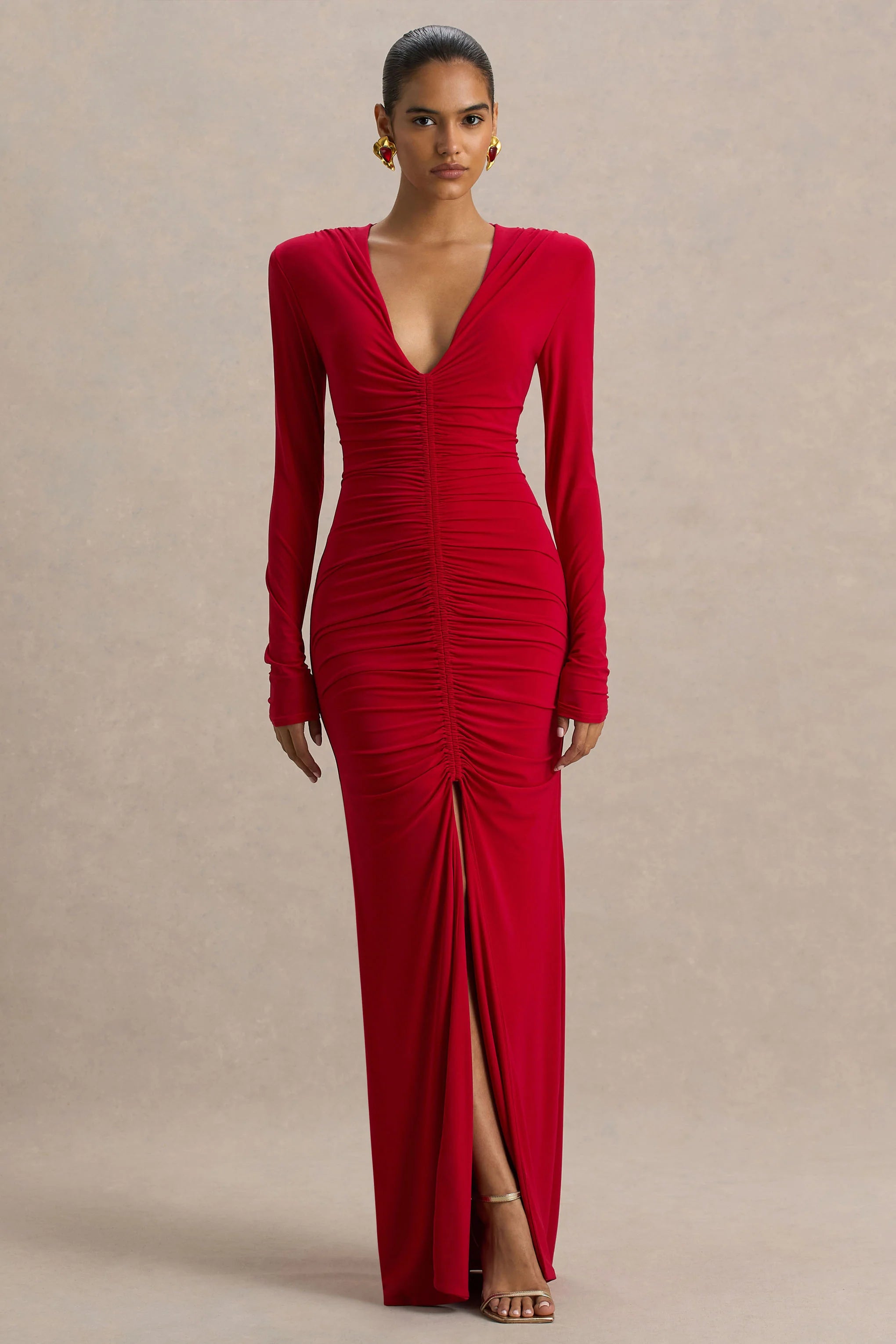 Introducing our latest show-stopped, Jewel. Cut from our premium stretch jersey in a striking red hue, this sculpting maxi hugs every curve while offering a sleek, floor-sweeping silhouette. With a sultry plunge neckline, elegant long sleeves, and flattering ruched detailing, this dress is all about refined glamour. The high-front split adds a bold finishing touch, making Jewel your go-to for unforgettable entrances.
