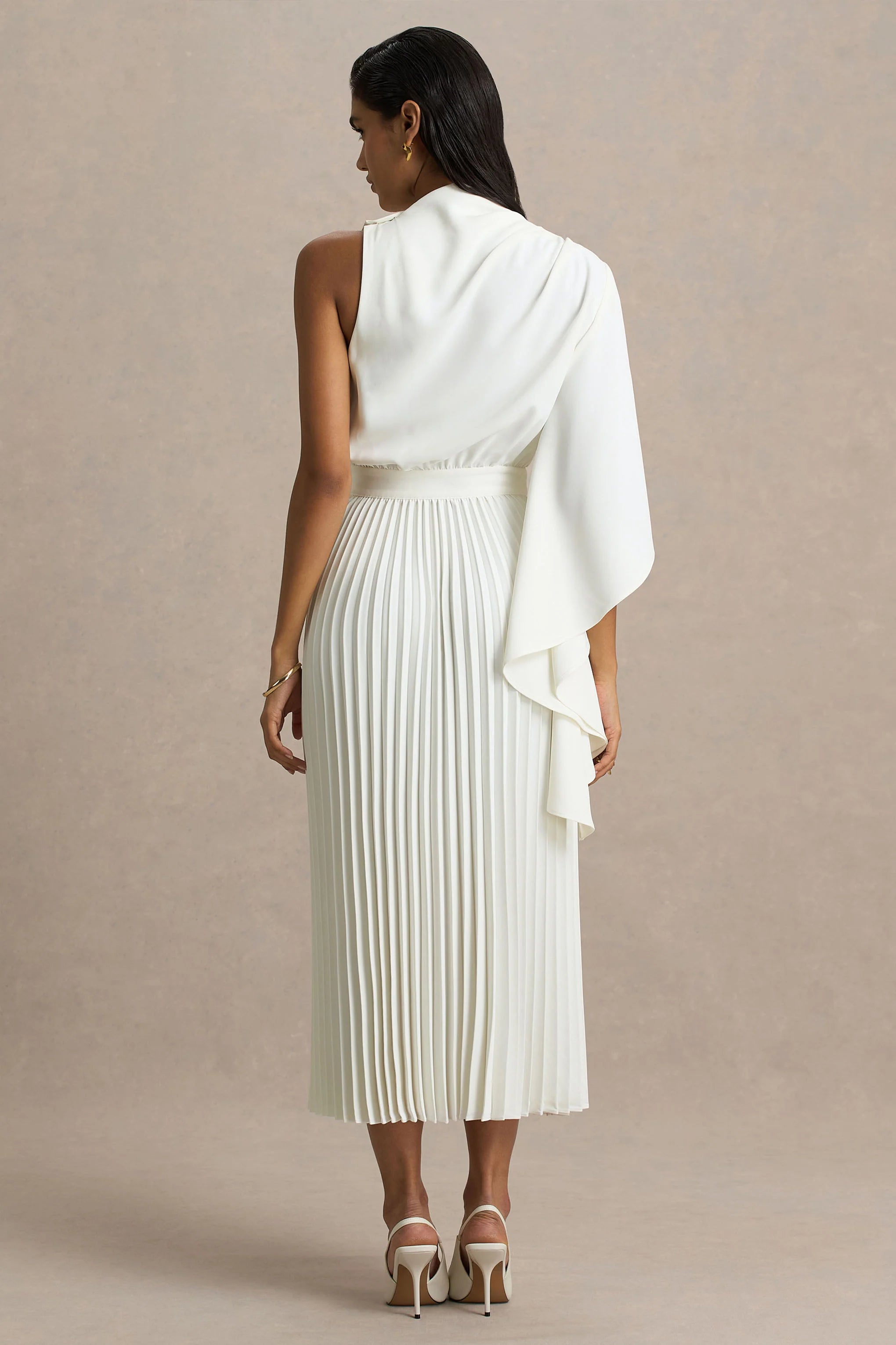 Turn heads effortlessly in Jimena, the dress designed for moments that demand elegance with an edge. Crafted from our premium cream crepe, this midi drapes gracefully, offering a captivating and soft silhouette. The asymmetric neckline adds a modern twist, while the blouson bodice ensures a flattering, relaxed fit. Draped detailing and a pleated skirt create movement with every step, making Jimena the ultimate choice for day-to-night occasions.