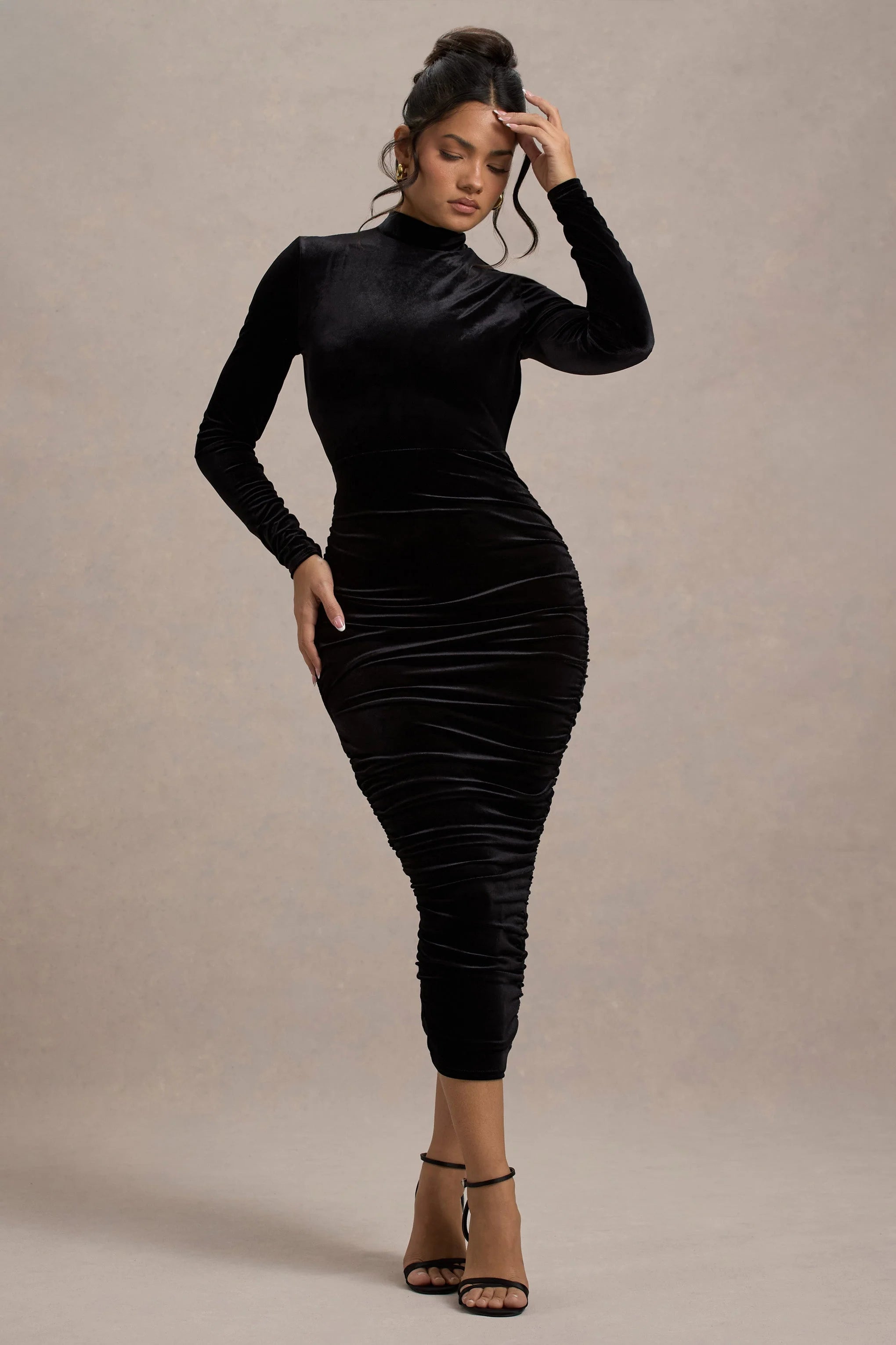 Arriving in a timeless, sophisticated silhouette, Joanna is this party seasons must-have. Curated in a luxurious stretch velvet, this sculpting black midi dress features a demure high neckline, alluring open-back and flattering ruching throughout its skirt. For an elegant work party attire, try styling Joanna with some diamante earrings and strappy stilettos.