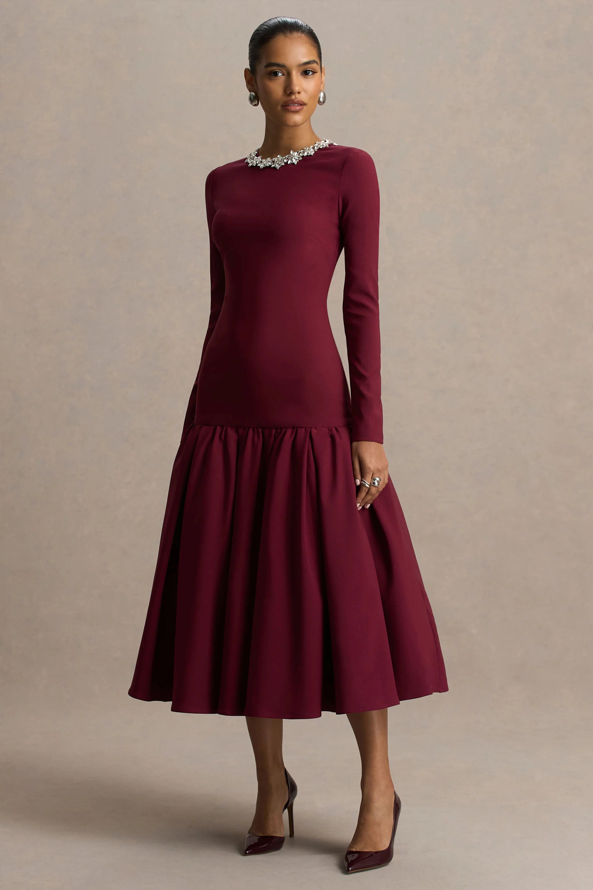 Elevate your evening look with the refined elegance of the Jovana. Cut from our premium burgundy crepe, this midi silhouette is both flattering and timeless. The hand-embellished crew neckline adds a touch of glamour, while the long sleeves add chic sophistication. Designed with a drop waist that flows into a pleated skirt, this style brings effortless movement and grace to every occasion.