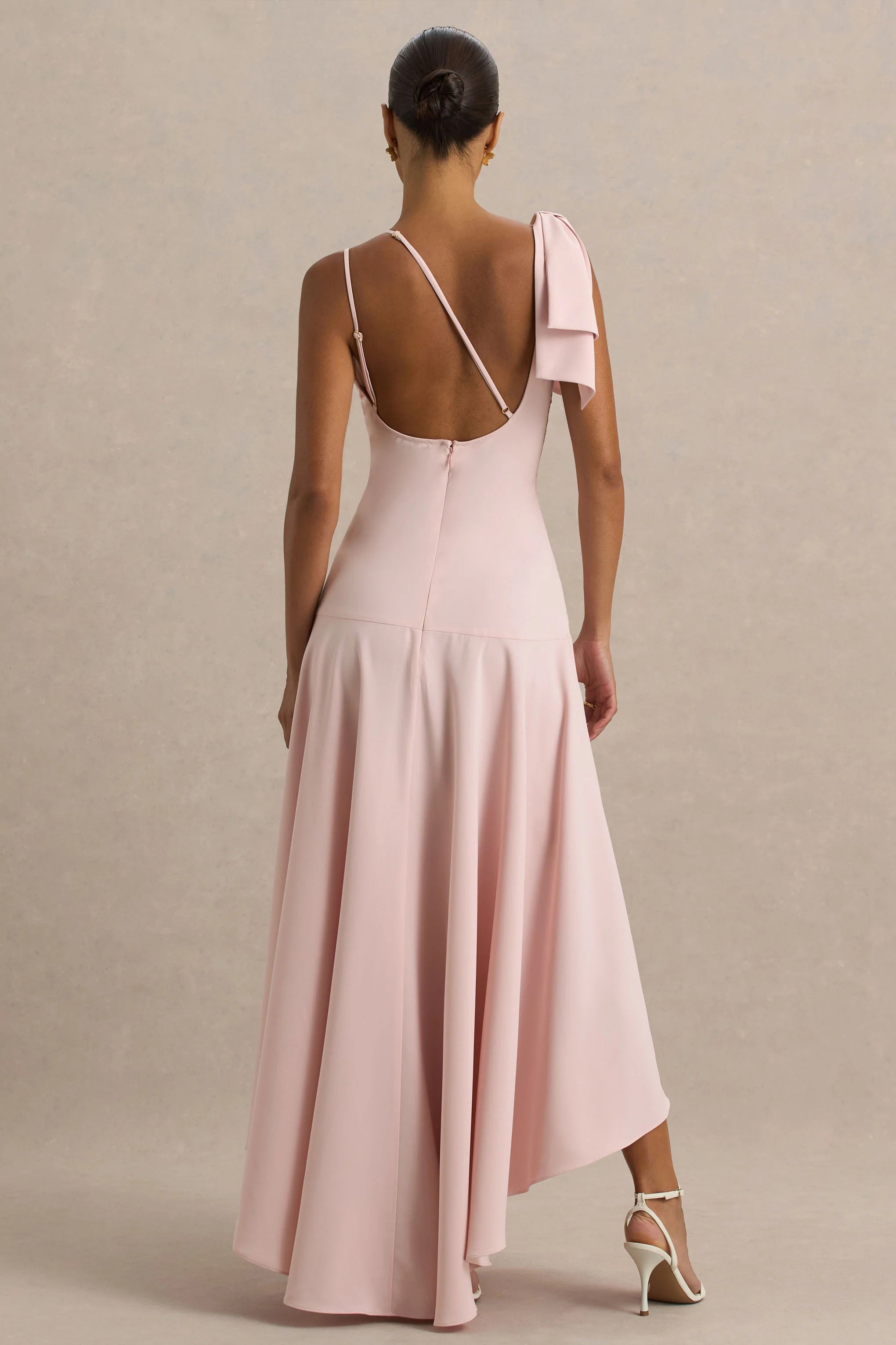 Softly sculpted and undeniably feminine, Julietta is made for modern romance. Crafted from our premium crepe in a delicate baby pink hue, this maxi dress offers a figure-flattering fit with a chic, elegant finish. The asymmetric neckline is elevated with an adjustable cami strap on one side and a statement bow sleeve on the other, creating a beautifully balanced silhouette. Complete with ruched detailing that flatters your figure, while a front-high split and open back add a touch of drama with every step. Style with dainty jewellery and sleek heels for a stand-out look.