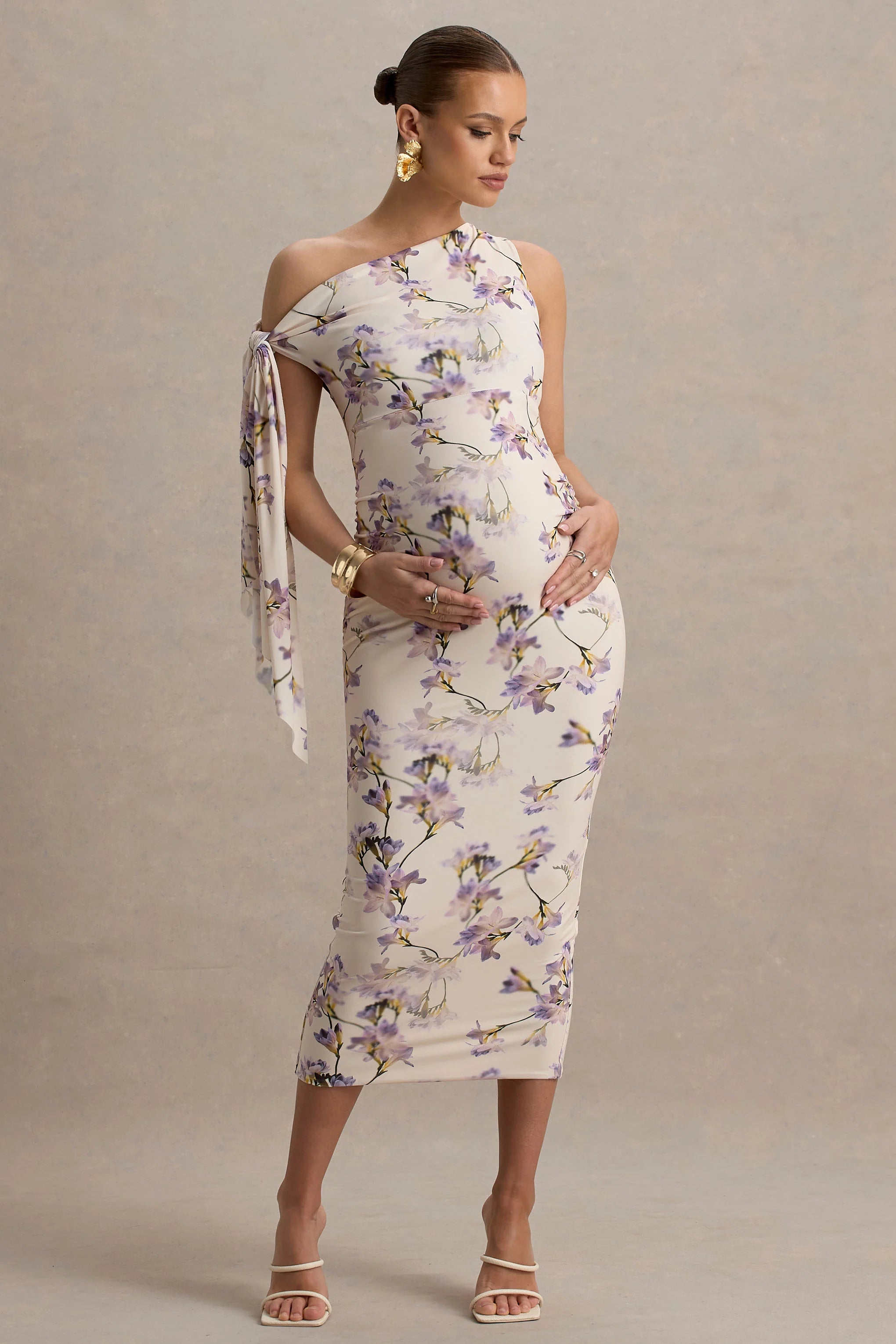 For a stunning maternity look that will turn heads, say hello to Katarine. This midi dress is cut in our premium stretch jersey that will flatter you from every angle, in a captivating pattern of peach floral print. Finished with ruched detailing and a striking knot sleeve to add a little drama. This piece is a go to for any dressed up moments this season.