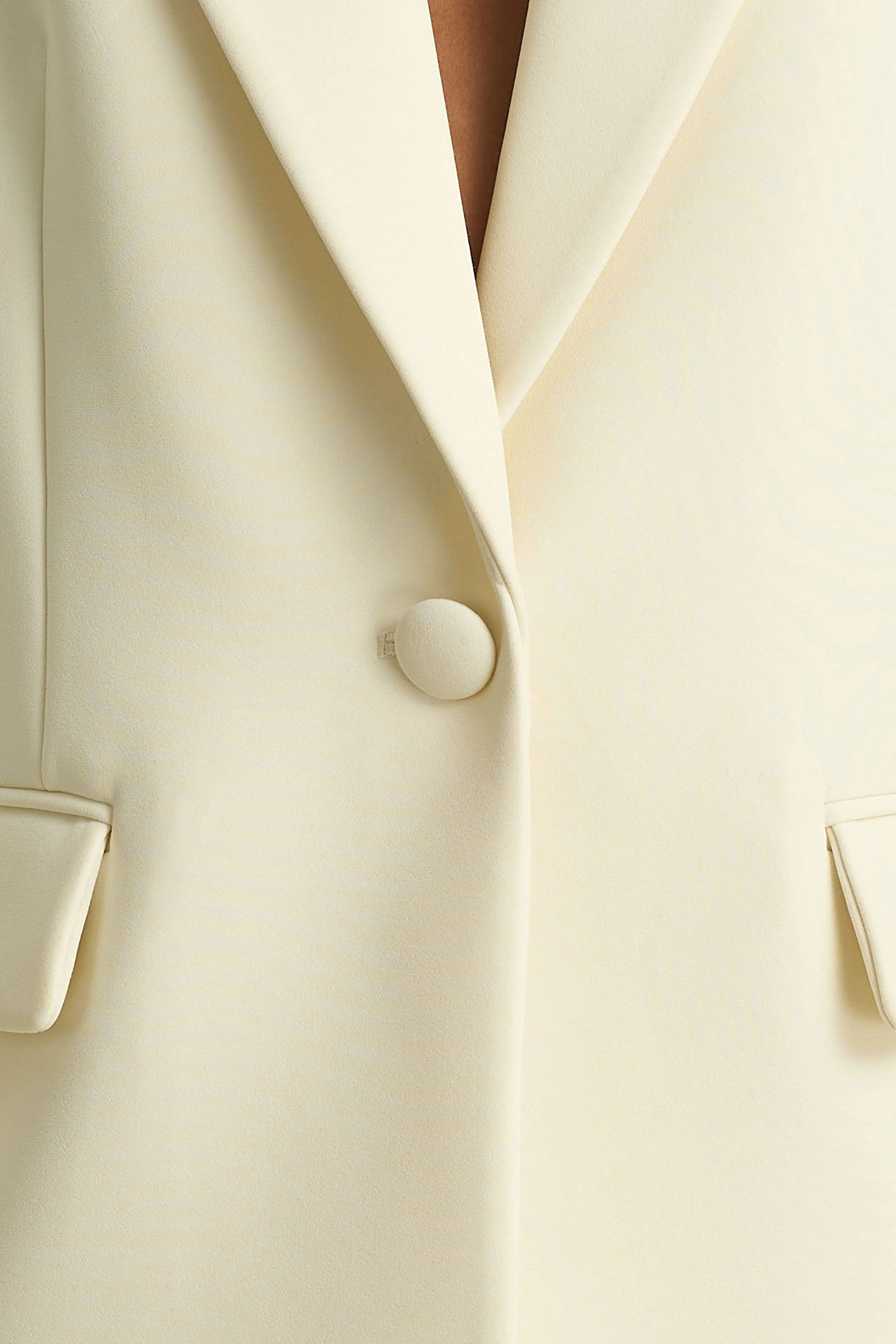 Power dressing meets effortless elegance with Katherine. Tailored from our premium cream crepe, this piece is cut to a boxy fit for a modern, structured silhouette. A plunge neckline with a standard collar adds sleek sophistication, while the button closure keeps the look polished. A versatile wardrobe staple, perfect for making an impact from desk to dinner.