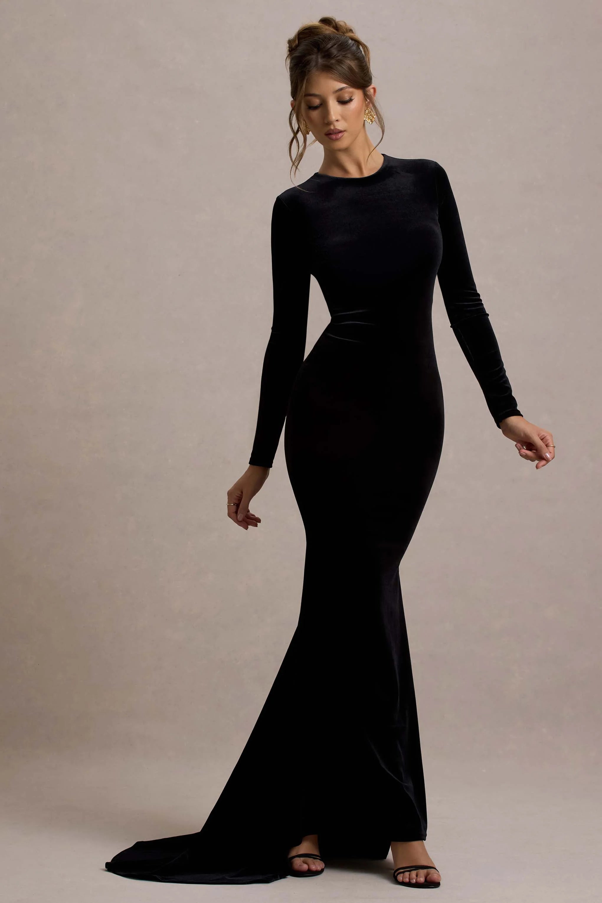 Refresh your formal wardrobe with this seasons coveted maxi Keaton. Crafted in a sculpting premium black velvet, this long-sleeved dress is defined by its sultry open-back detail. Try pairing this elegant staple with a sleek bun and gold earrings to create an effortless look.