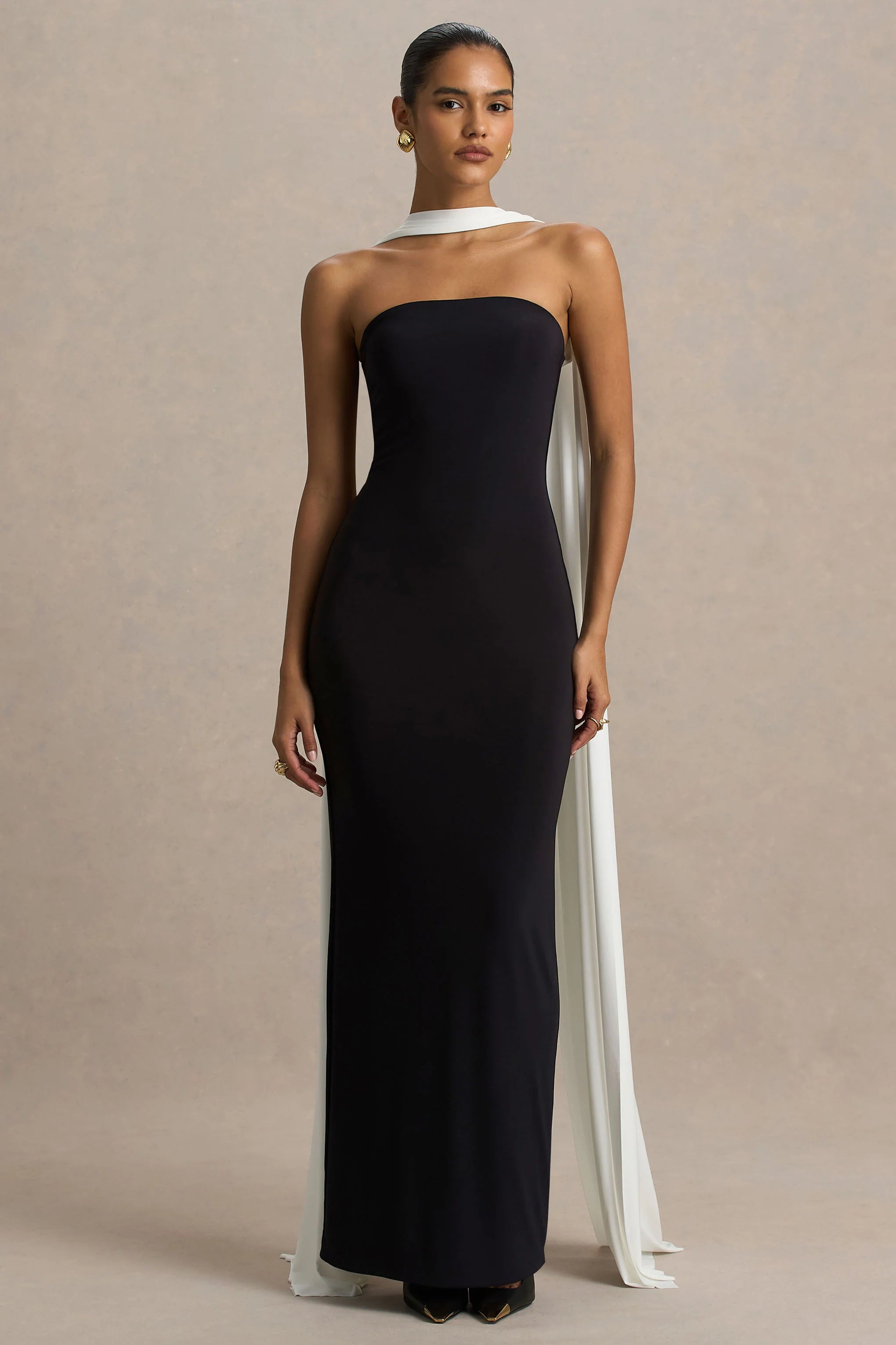 Step into chic sophistication with Kelilah, the dress made to captivate from every angle. Crafted from our premium black stretch jersey in a floor-skimming maxi length, it offers a sleek, figure-flattering fit. The bandeau neckline is paired with a striking white scarf detail for a bold, modern twist, while the open back adds a subtle touch of allure. Perfect for evening events or any occasion where effortless elegance meets statement style, Kelilah is a must-have showstopper.