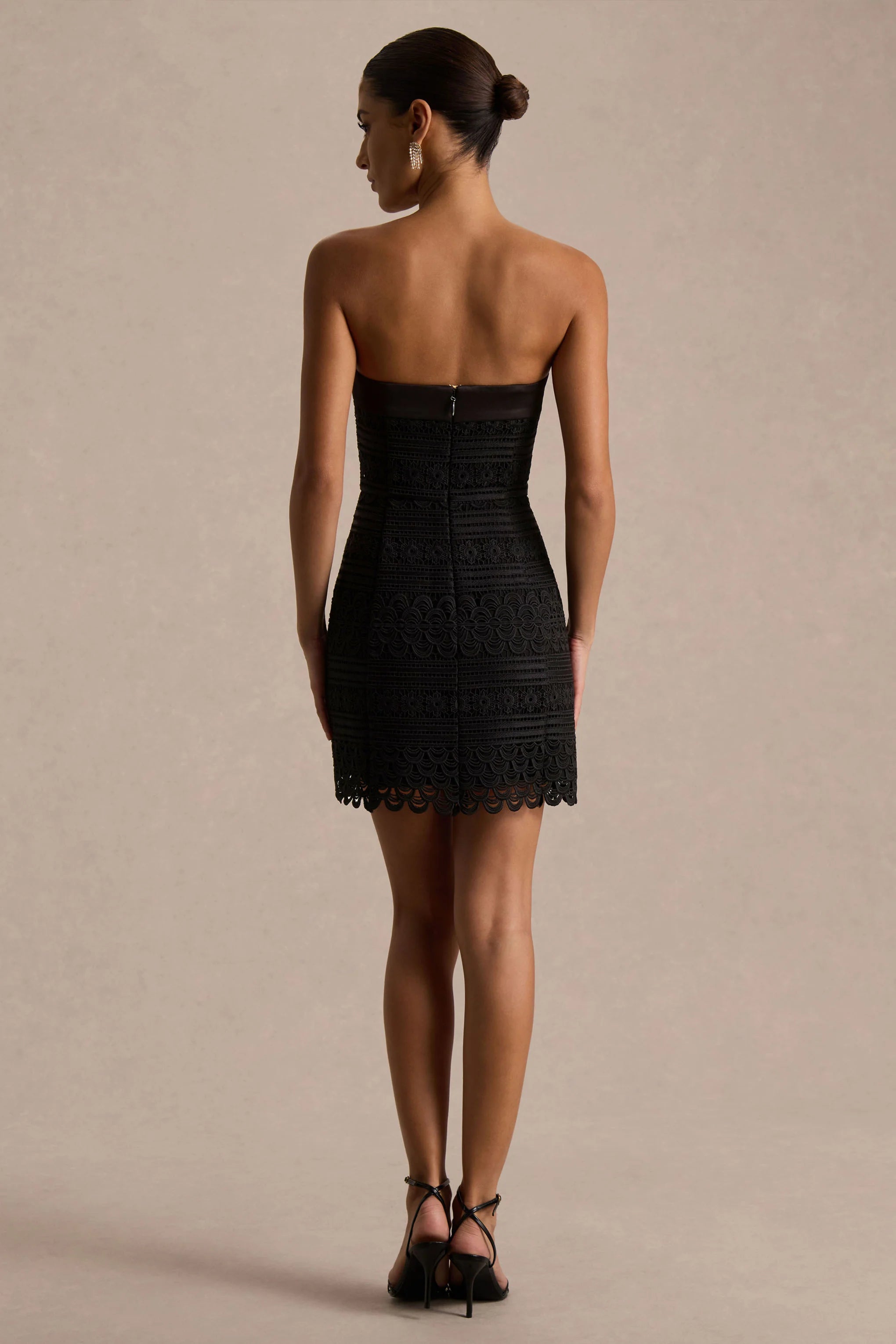 Make an entrance in Kerry. Crafted from our premium black lace, this mini dress is effortlessly bold and undeniably chic. The sleek bandeau neckline is perfectly framed by a statement bow detail, adding a touch of playful sophistication. Made to turn heads, Kerry is your go-to for nights that demand confidence and just the right amount of drama.
