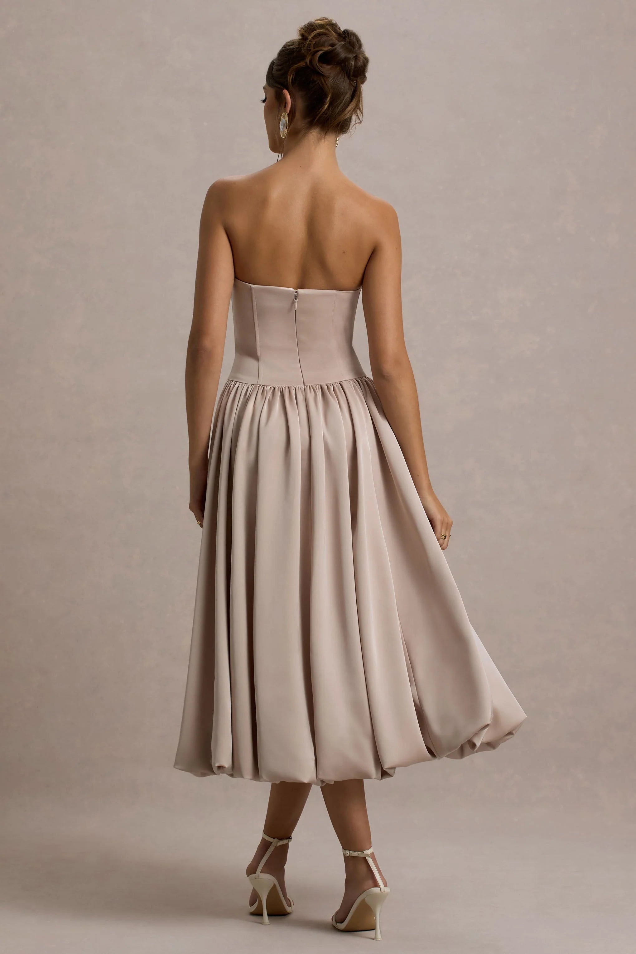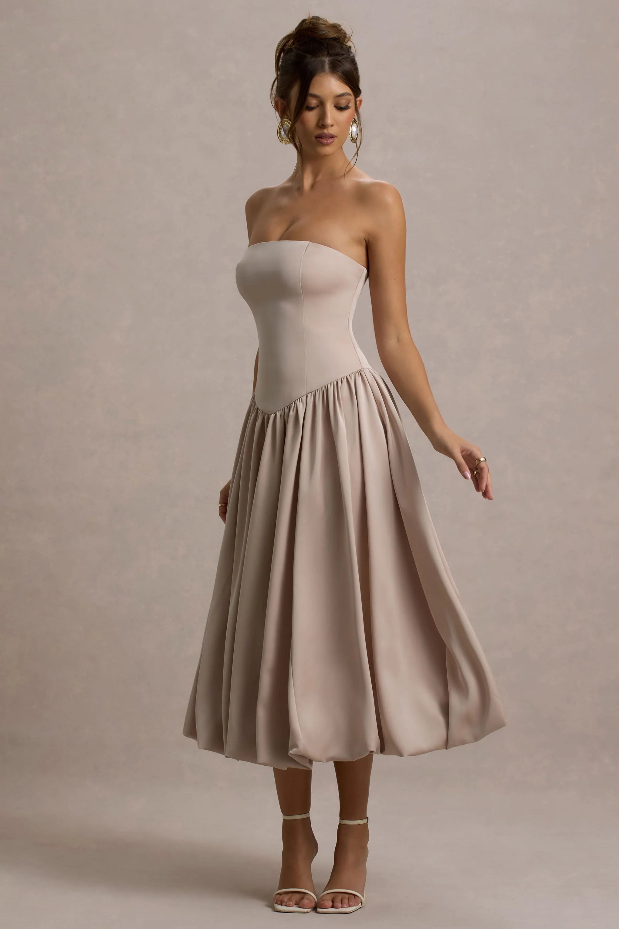 Effortlessly elegant, Keyton is a stand-out staple. Expertly designed in a soft champagne shade of our luxurious satin, this strapless midi dress boasts a boned corset bodice and flattering dipped waistline. Complete with a puffball skirt, whats not to love with Keyton?