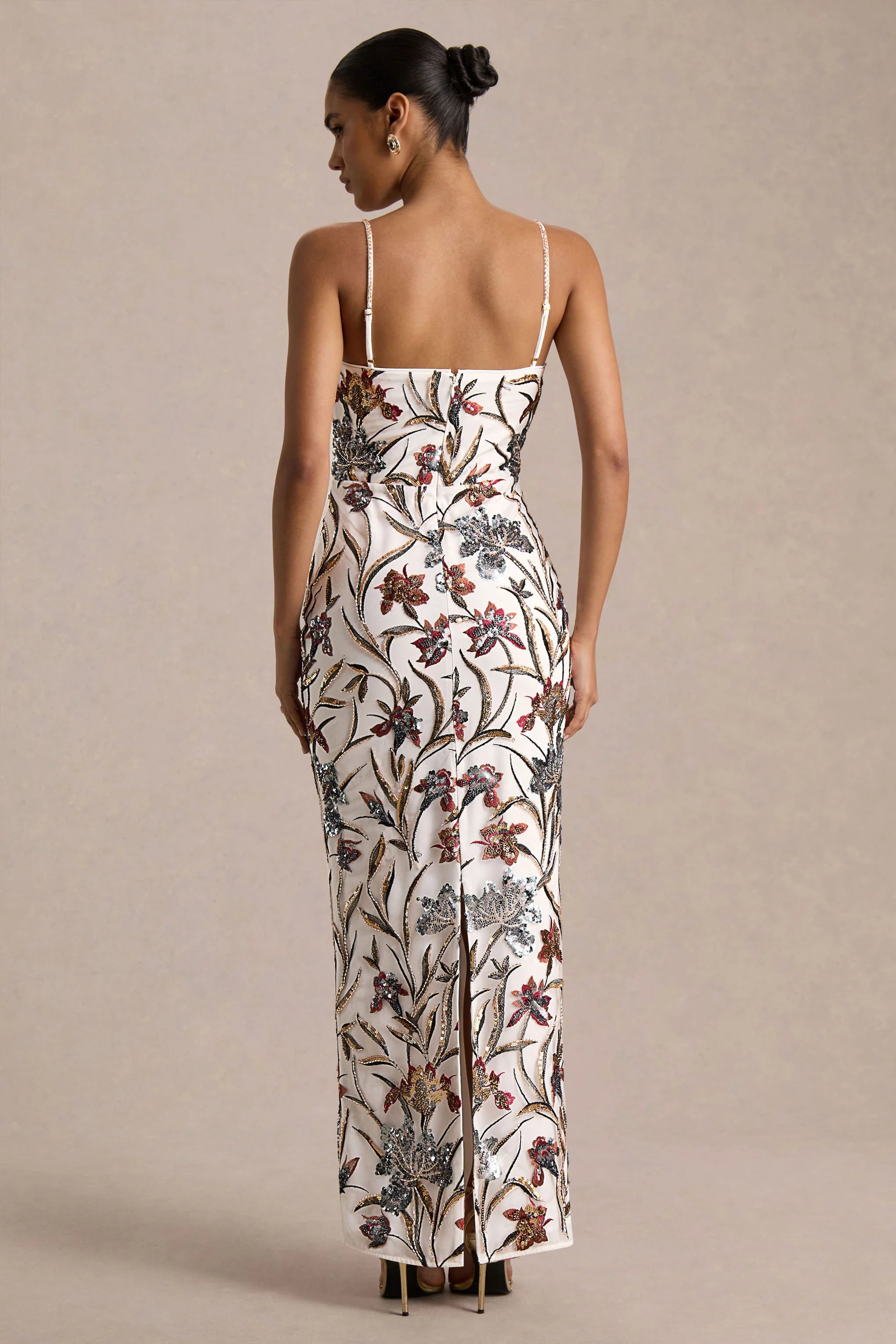Delicate detail meets timeless glamour in Kyle . Designed in our premium cream floral embellishment, this maxi silhouette is both feminine and striking. The square neckline and adjustable cami straps frame the décolletage beautifully, while the centre-back split ensures ease of movement with a sultry touch. Romantic yet refined, Kyle is the perfect choice for occasions that call for elegance with a statement finish.