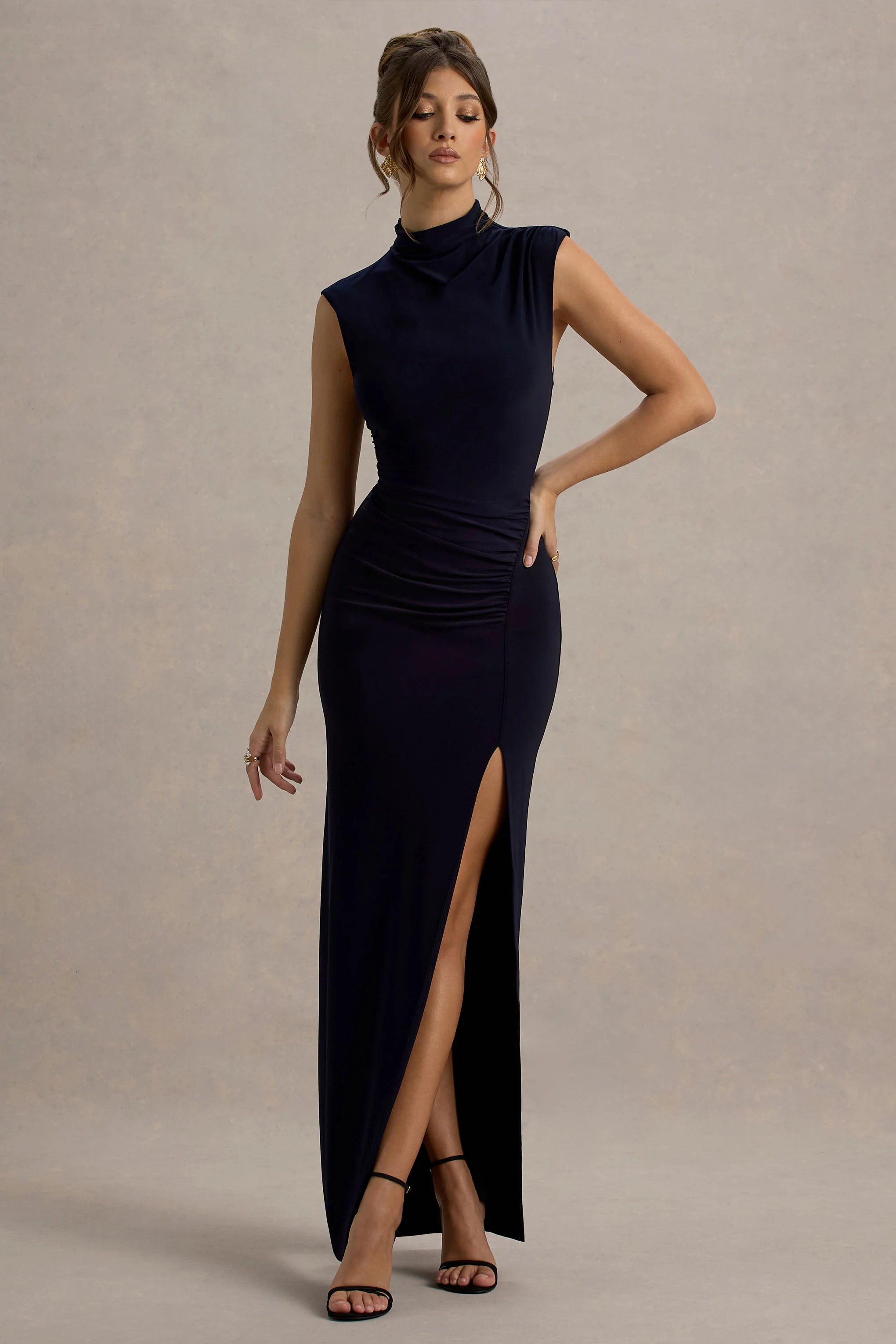 As flattering as it is flawless, captivate from all angles in Lanetta. Crafted in a navy shade of our premium jersey known for its stretch properties, this curve-enhancer boasts flattering ruching to cinch your natural silhouette. Further enhancing its charm is a delicately tucked high neckline and sultry leg split that's ensured to turn heads at your next event.