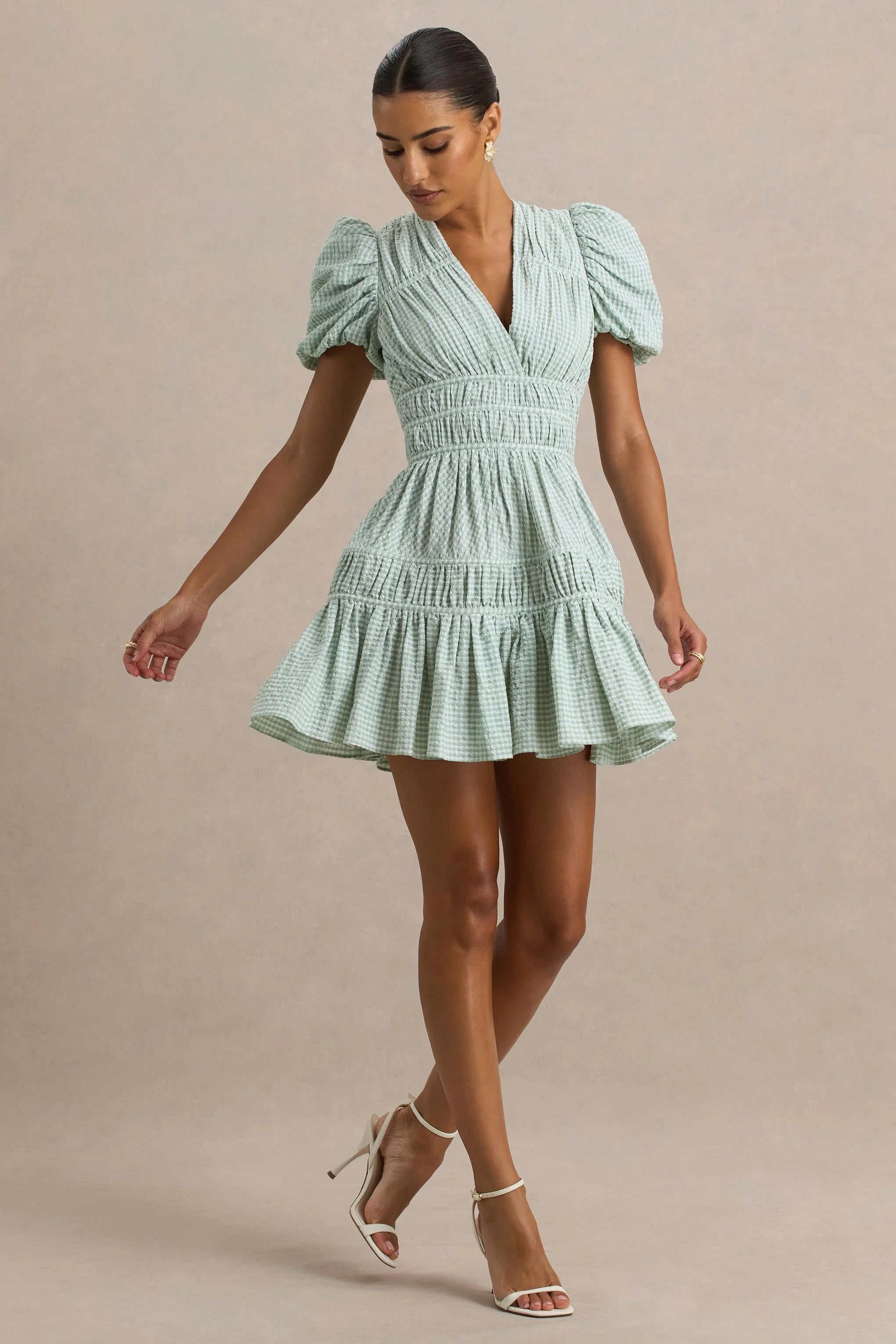 Summery chic and effortlessly feminine, Laurelle is your go-to mini for sunshine-soaked days. Cut from our premium green seersucker, this playful dress features an extreme plunge neckline that delicately frames the decolletage. The voluminous puff sleeves and tiered ruffled skirt bring a romantic charm, while the keyhole back detail adds a touch of refined elegance. Whether it’s brunch with the girls or a weekend escape, Laurelle is made to turn heads.