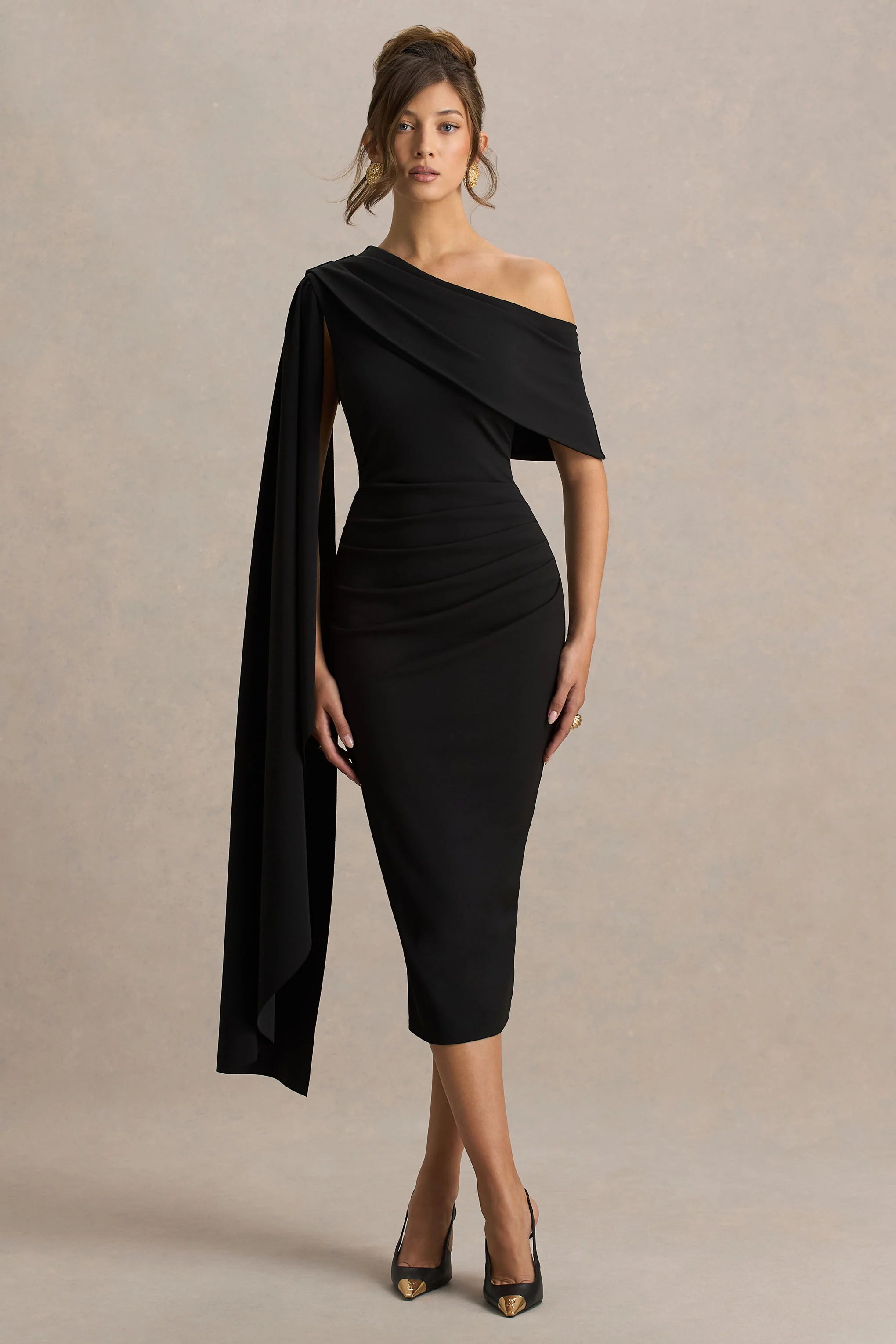 Introducing Leah, a striking piece designed to exude confidence and sophistication. Crafted from our sculpting black premium scuba crepe, this sleek midi silhouette is both flattering and refined. The asymmetric neckline and dramatic cape sleeve create a powerful, feminine look, while the centre-back split adds ease of movement with a sultry touch. Leah is elegance with an edge, perfect for any occasion that calls for impact.