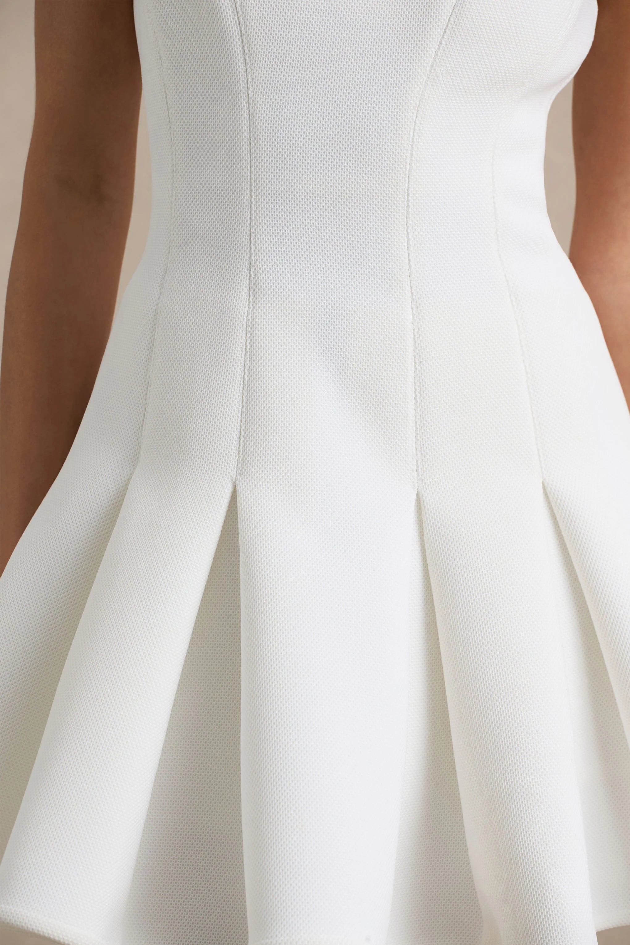 Say hello to the next timeless addition to your wardrobe, Leilani. Crafted from our premium crepe in a crisp white hue, this mini dress is the epitome of refined elegance. Featuring a sleek racer neckline that sculpts the silhouette with modern sophistication before flowing into a beautifully pleated skater skirt that adds a touch of graceful movement. Leilani perfectly balances allure and poise, making it the ultimate piece for unforgettable occasions.