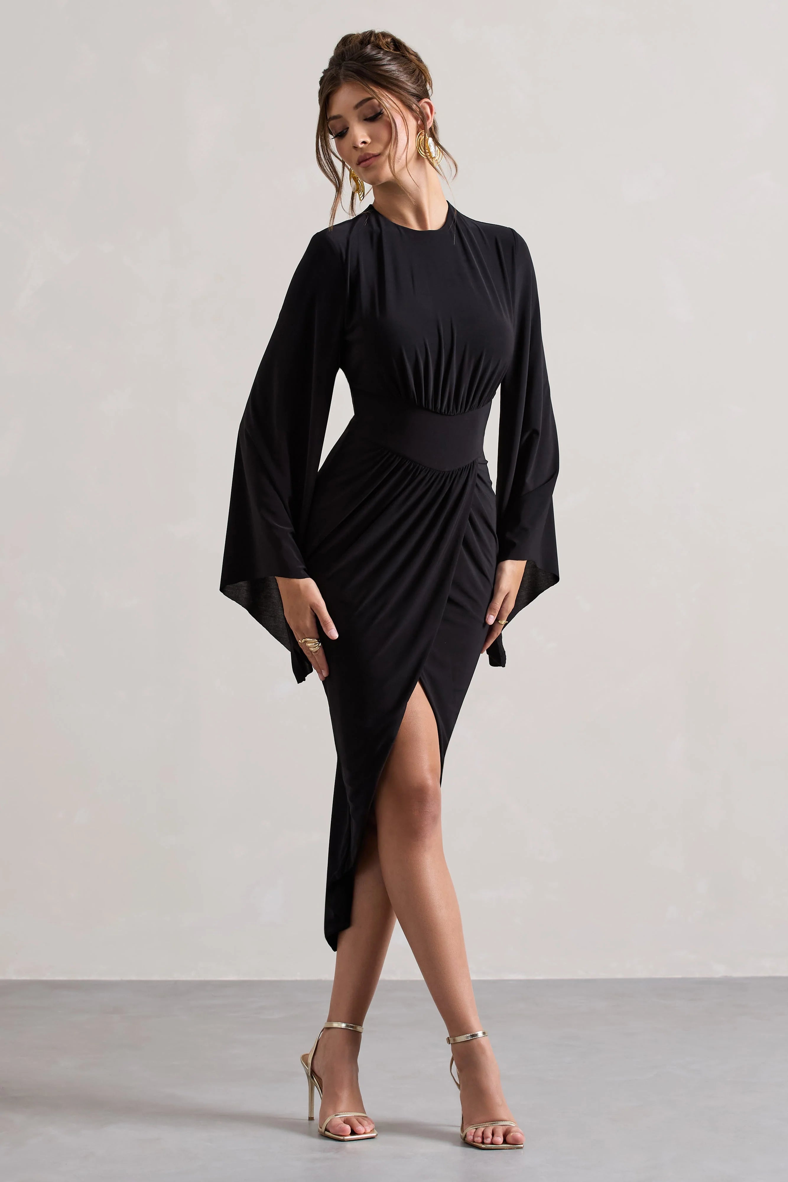 Captivate from all angles in Lennox, our black midi dress. Arriving in our signature stretch jersey and boasting an extra flattering fit, Lennox is detailed with long draped sleeves and a gathered waist. Finished with a classic wrap style skirt, style this midi with a sleek bun and some strappy stilettos for a timeless look.