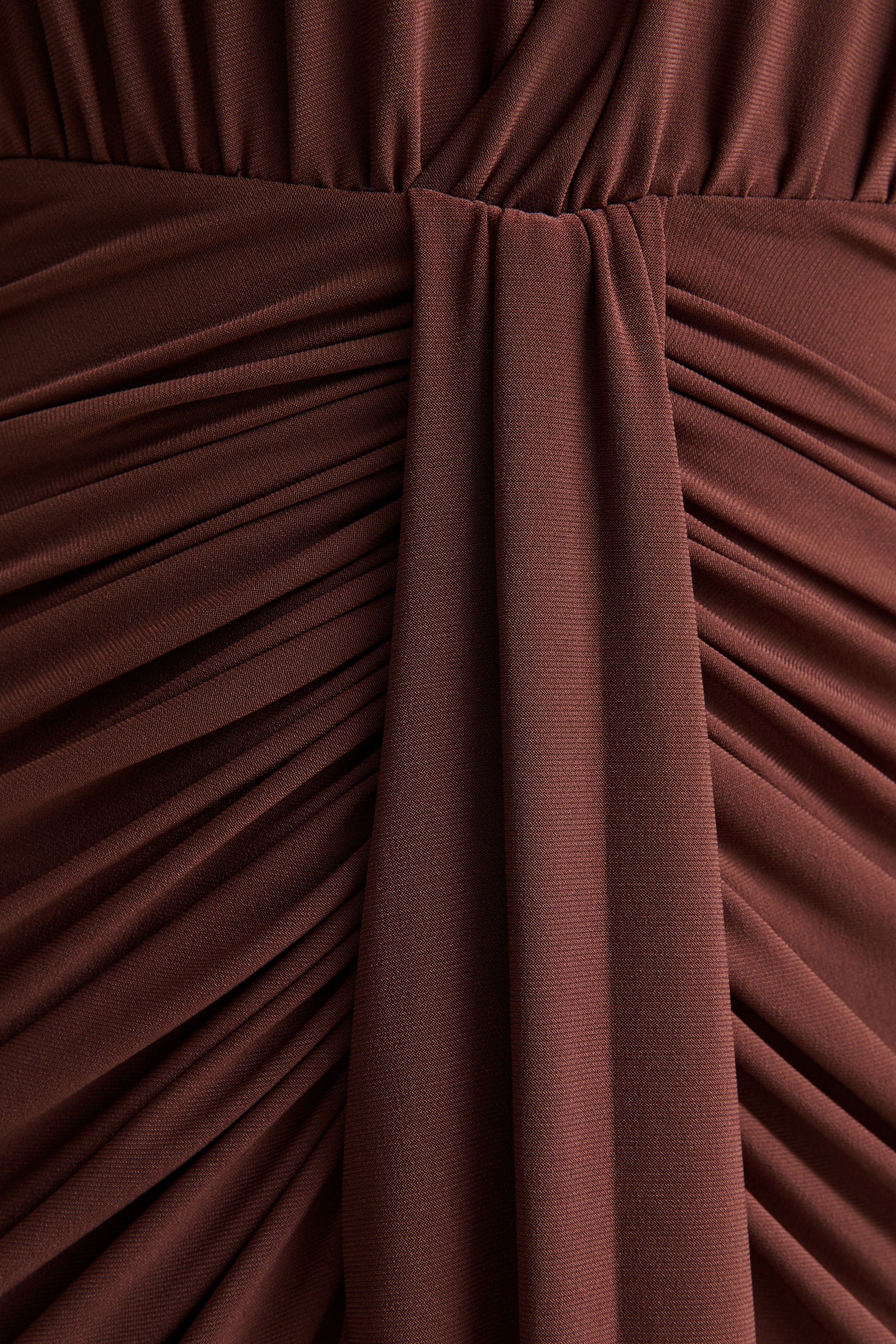 Lesley exudes confidence and sophistication from all angles. Crafted from our premium stretch jersey in a deep chocolate hue, this maxi is designed to sculpt and flatter every curve. The plunging neckline creates a bold, feminine silhouette, while the gathered and ruched detailing throughout enhances its fluid drape and contouring fit. Lesley is the ultimate statement in refined glamour, made for moments that demand attention.