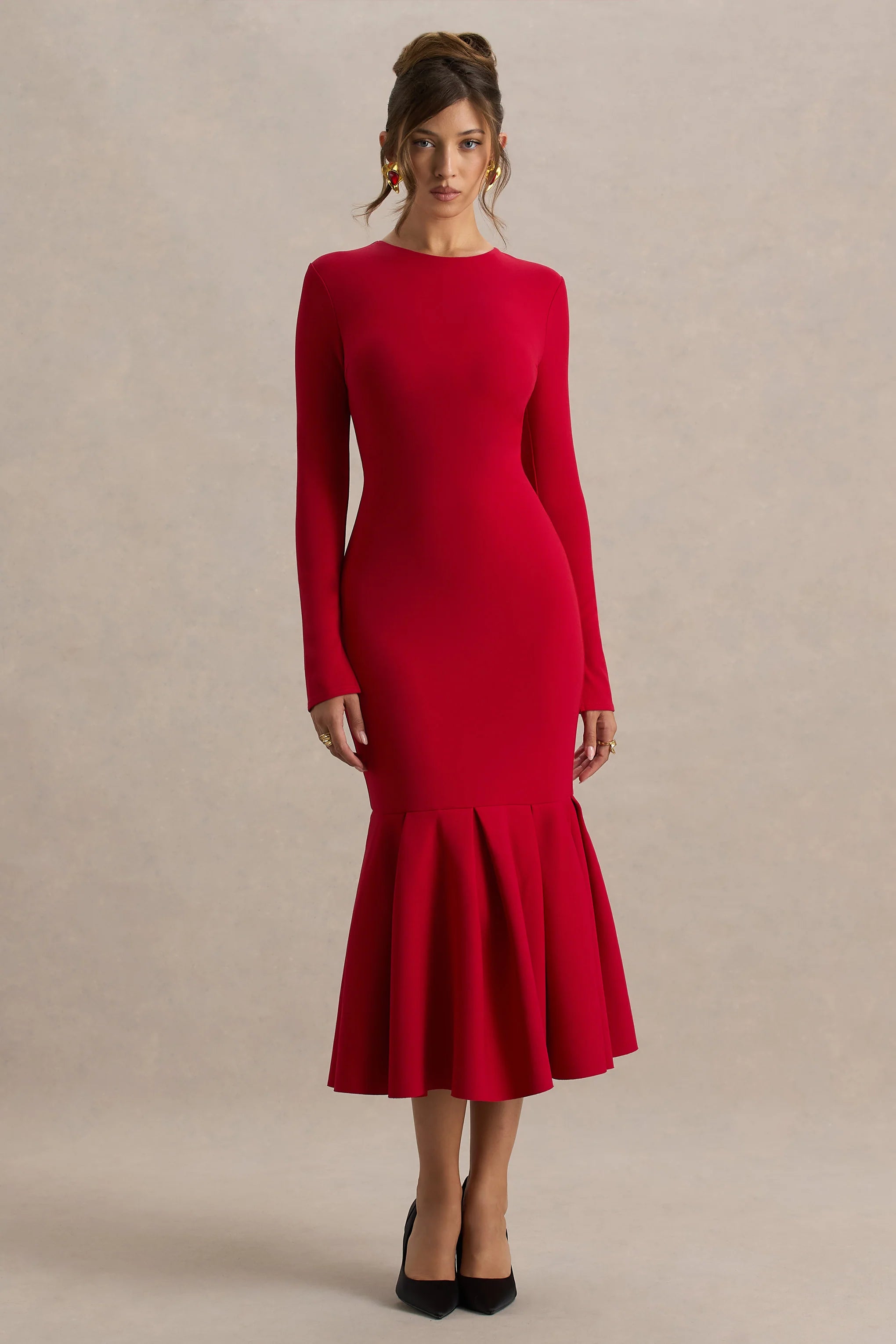 Turn heads in our striking Liberty maxi. Cut in a rich red hue of of premium scuba crepe, this gown is the epitome of modern elegance. This sleek silhouette features a classic high neckline and long sleeves for a polished look that is contrasted with the dramatic mermaid finish. Liberty is the perfect piece for black tie occasions that call for a show-stopping moment.