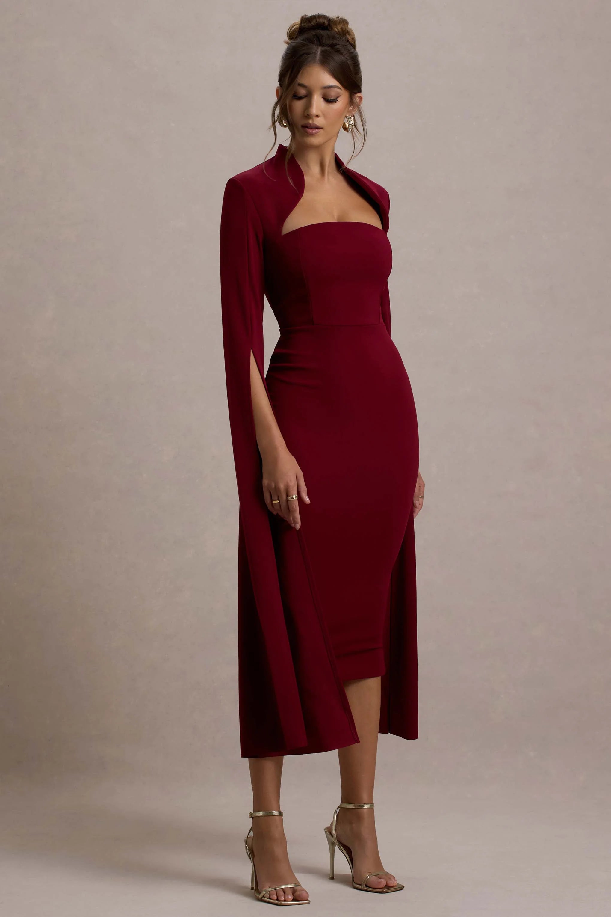 Designed for special occasions, make a statement in Linden. Crafted in a rich berry hue of our premium scuba crepe, this bodycon is defined by an artful high neckline and regal cape sleeves. Compliment this berry midi dress with some glistening gold accents and bouncy curls for the perfect occasion look.