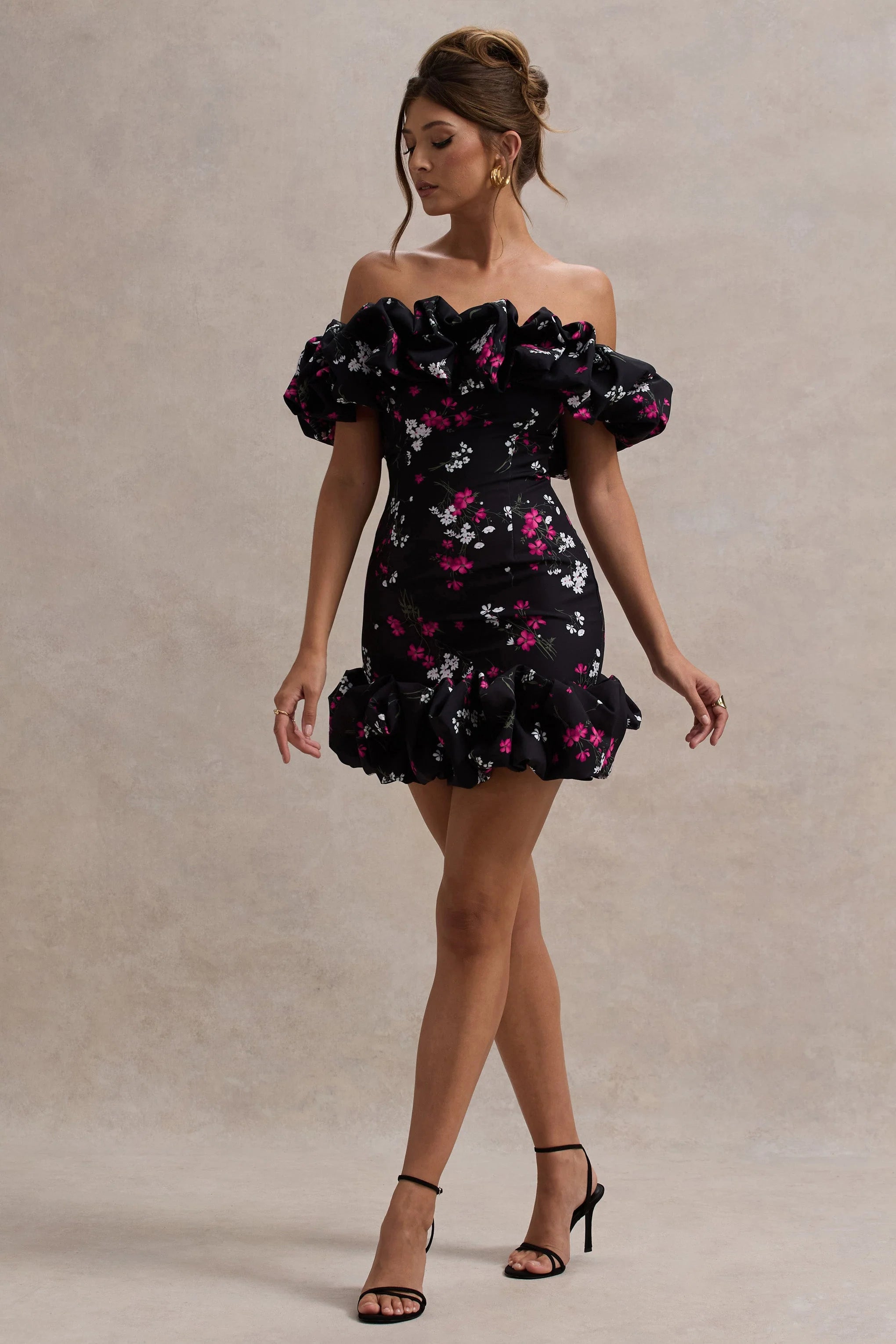 Beautiful and bouncy, Lindo is bound to become your go-to day drinks mini. Beautifully adorned in our premium black ditsy floral print stretch crepe, the piece epitomises supreme femininity with its decorative bardot neckline and ruffled puff hemline. Enhance Lindo with some dazzling silver accents at your next event.
