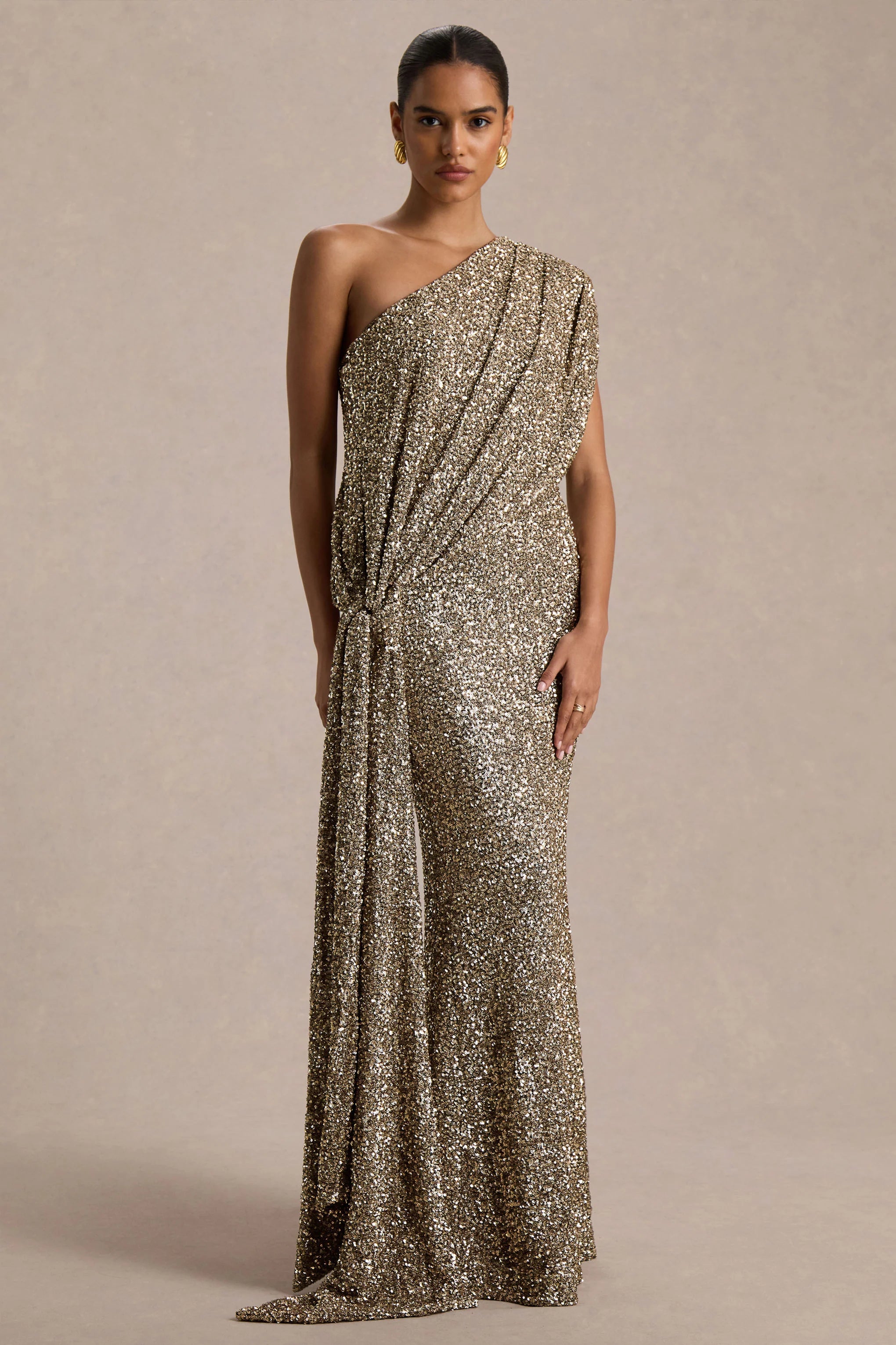 Say hello to Liori, the ultimate expression of refined glamour. Crafted from our premium champagne sequin, this maxi dress catches the light from every angle for a radiant, show-stopping look. The asymmetric neckline and draped bodice create a sculpted, feminine silhouette, while the elegant sash detail adds a touch of sophistication and movement. Perfect for the most special of occasions, Liori is designed to shimmer all night long.
