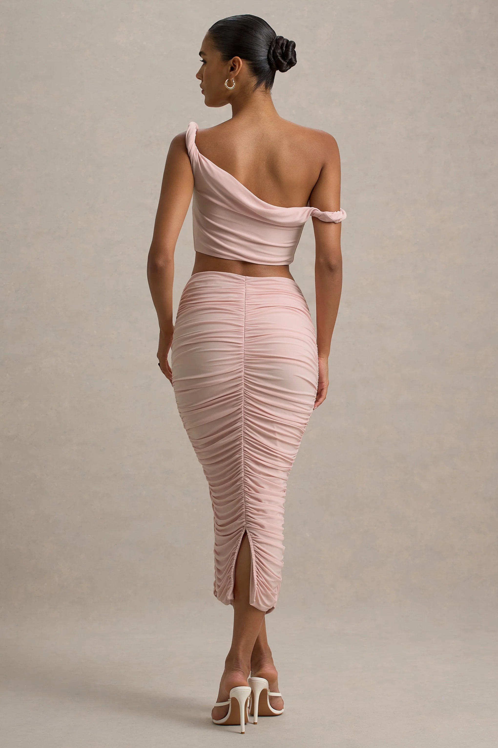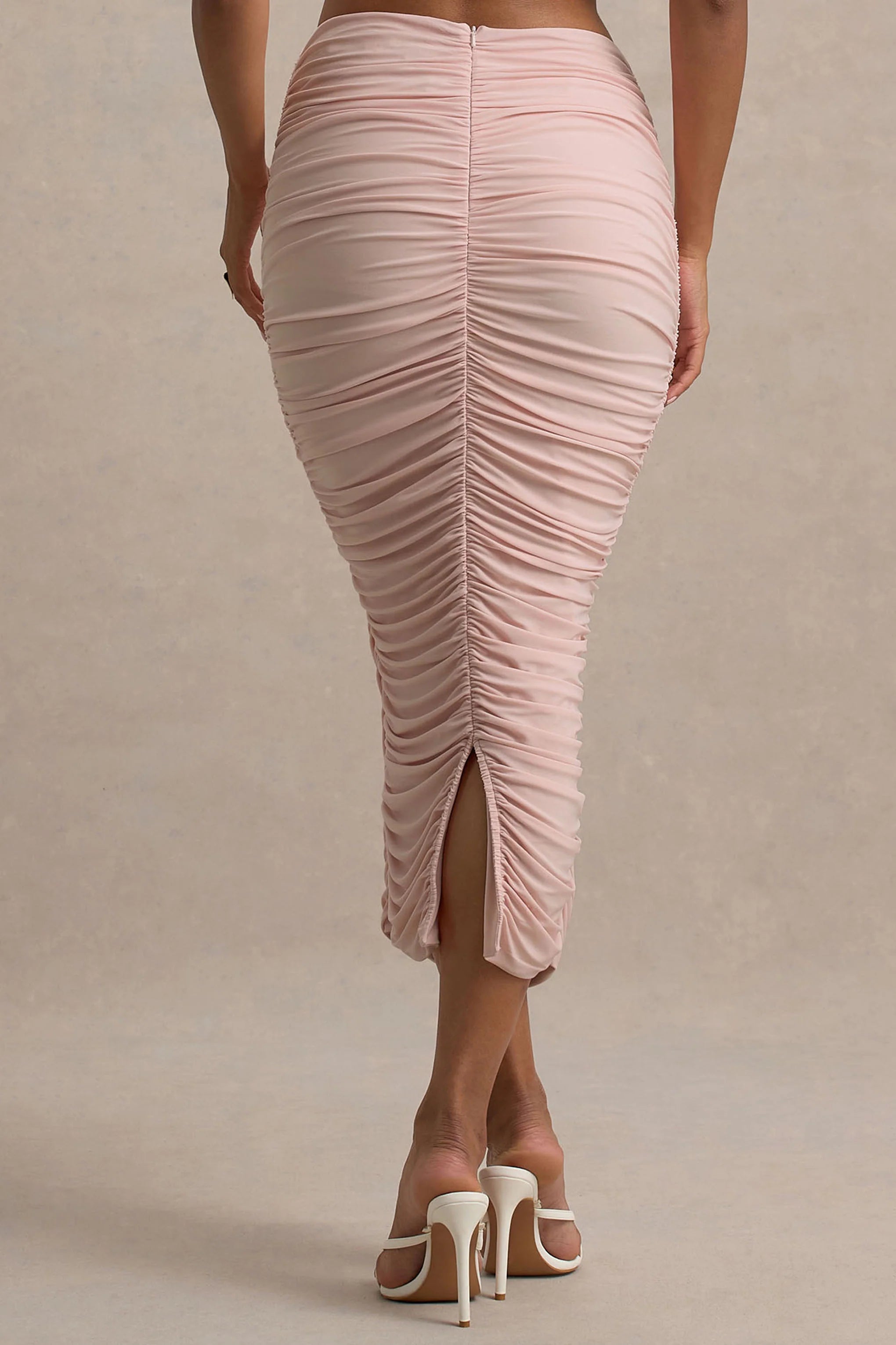 From day to night, Lively will have you looking effortlessly chic and snatched. Curated from our premium stretch jersey, for the ultimate figure flattering finish, in the perfect summer shade of light pink. Elevated with gorgeous ruched detailing that enhances your figure, this midi skirt will complete any outfit. Style with our matching Ariel top and sleek heels for any dressed up moment this season.