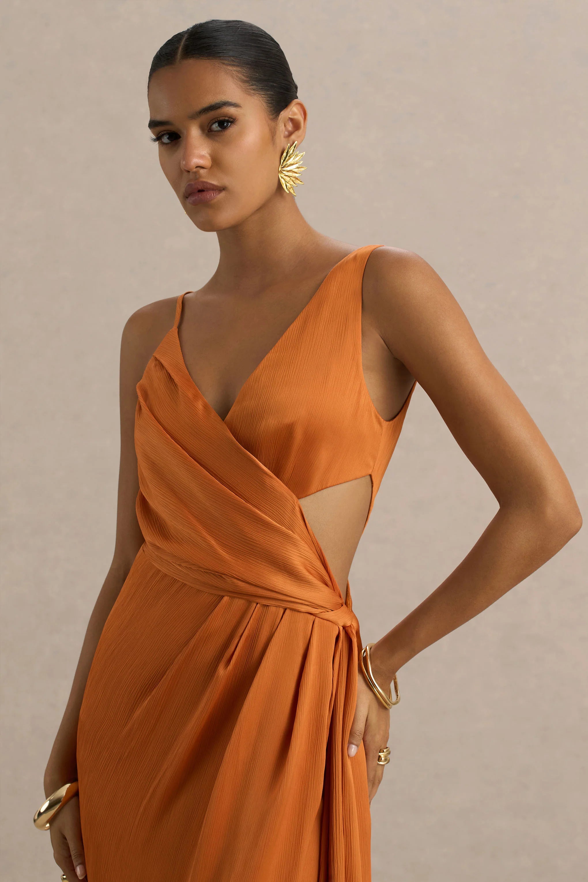Make a striking statement with Livia, a bold and beautiful design made for standout occasions. Crafted from our premium orange chiffon, this maxi dress embodies vibrant sophistication. The plunge neckline and body cut-out detail strike the perfect balance of sultry and refined, while the wrap and sash elements cinch the waist for a flattering silhouette. Finished with an adjustable strap and a front-high split, Livia is made for sunset cocktails and golden hour glamour.