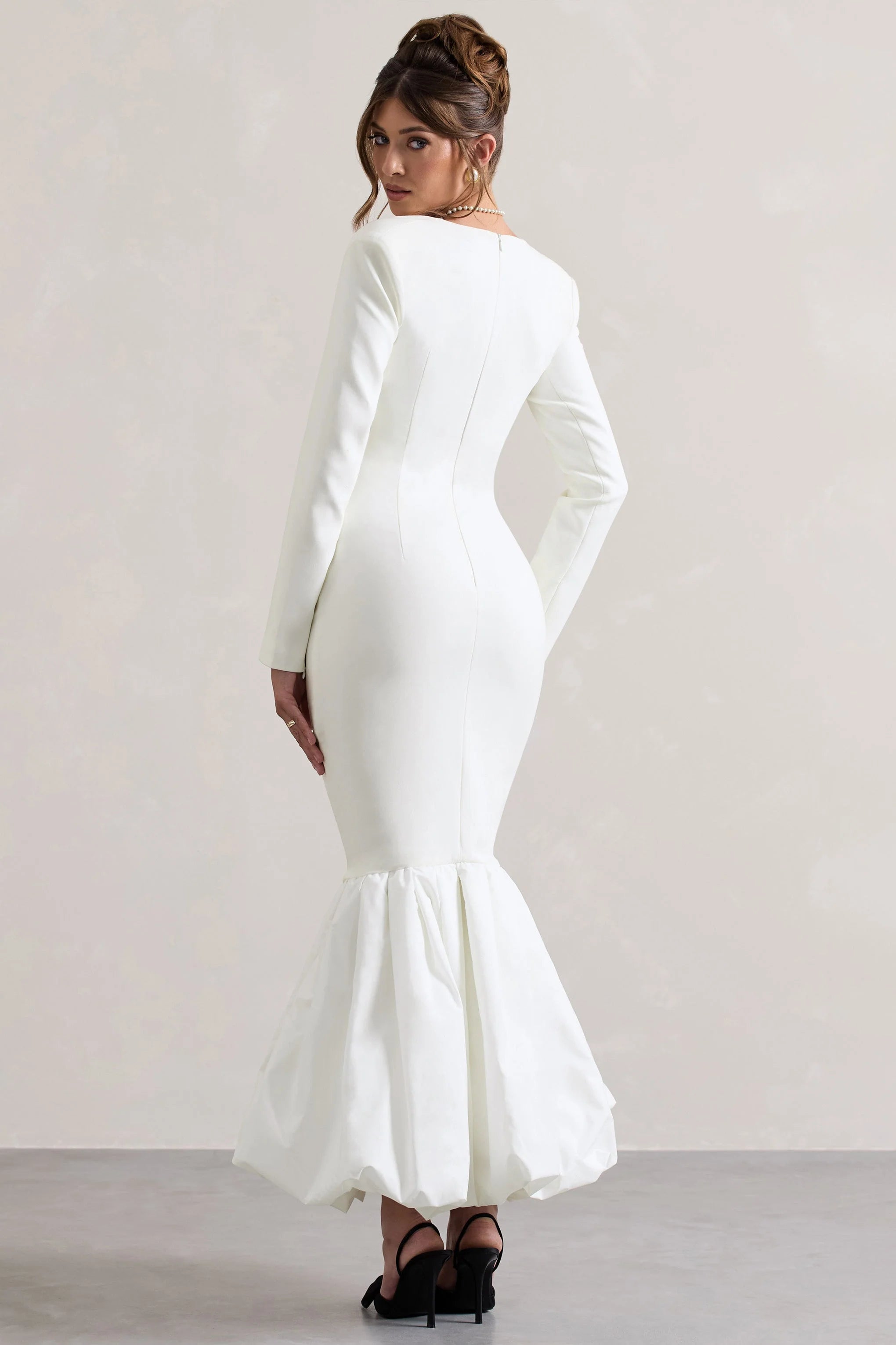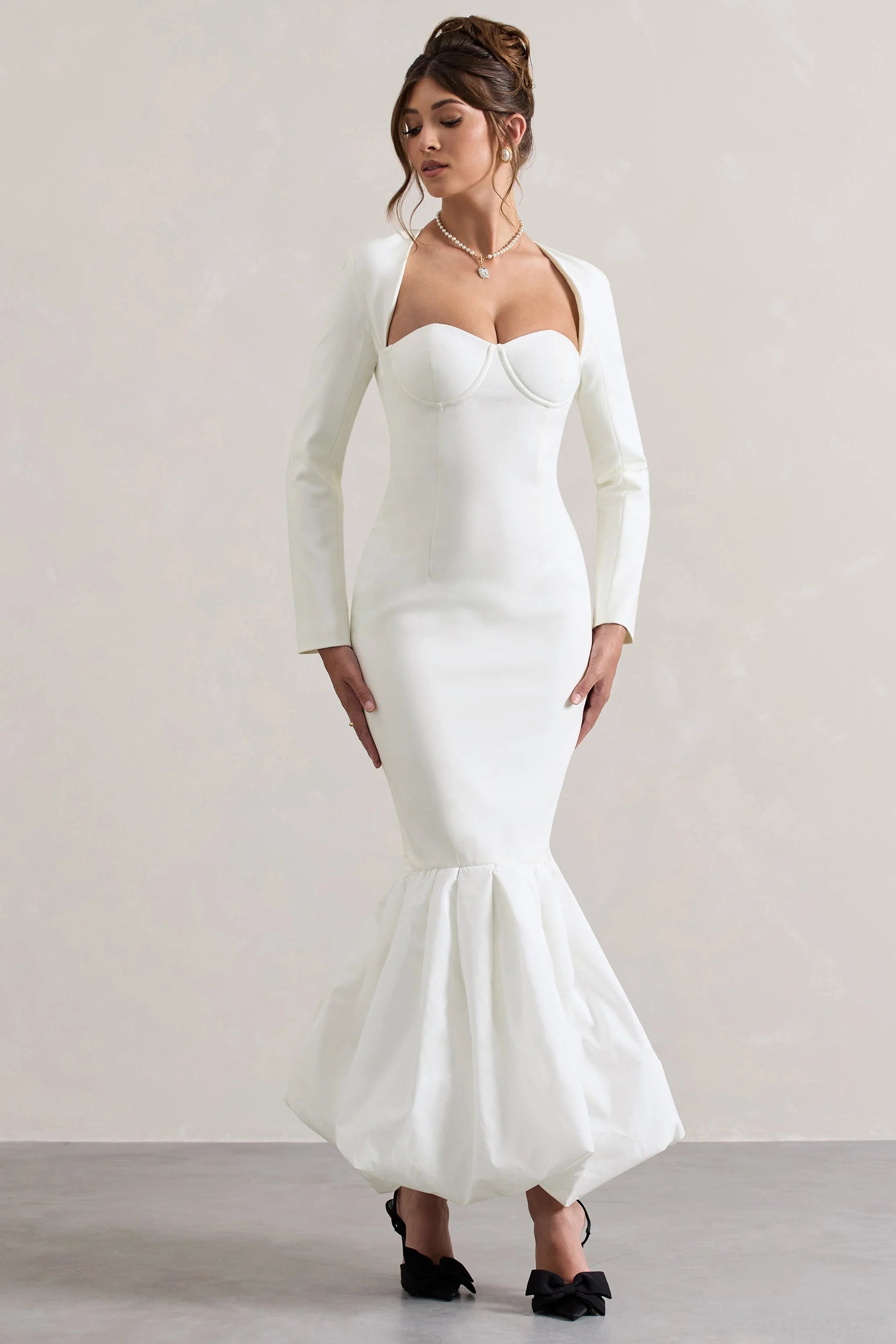 Get ready to be best dressed in London. This sophisticated cream maxi dress has been cut in a premium crepe and boasts a feminine sweetheart neckline with long sleeves and a voluminous puffball hem. Style London with our Just A Fling heels to complete your look.