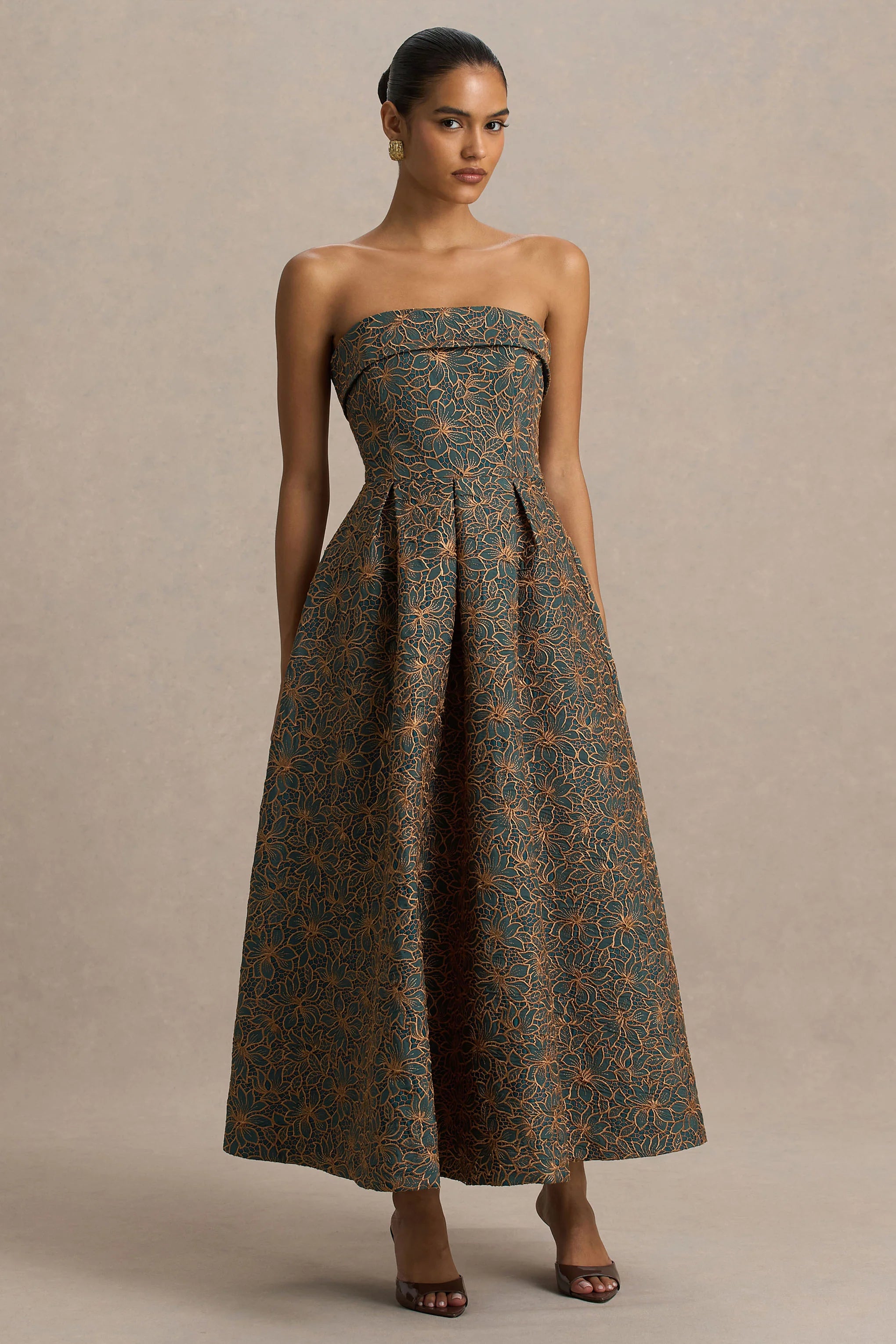 Loretta is the dress that brings timeless elegance with an edge. Made from our premium embroidered woven fabric in deep green and rust, this midi dress flatters with its rich tones and structured silhouette. The sleek bandeau neckline and boned bodice sculpt the figure beautifully, while the pleated skirt adds volume and graceful movement. Loretta strikes the perfect balance of sophistication and drama, made for occasions that call for something unforgettable.