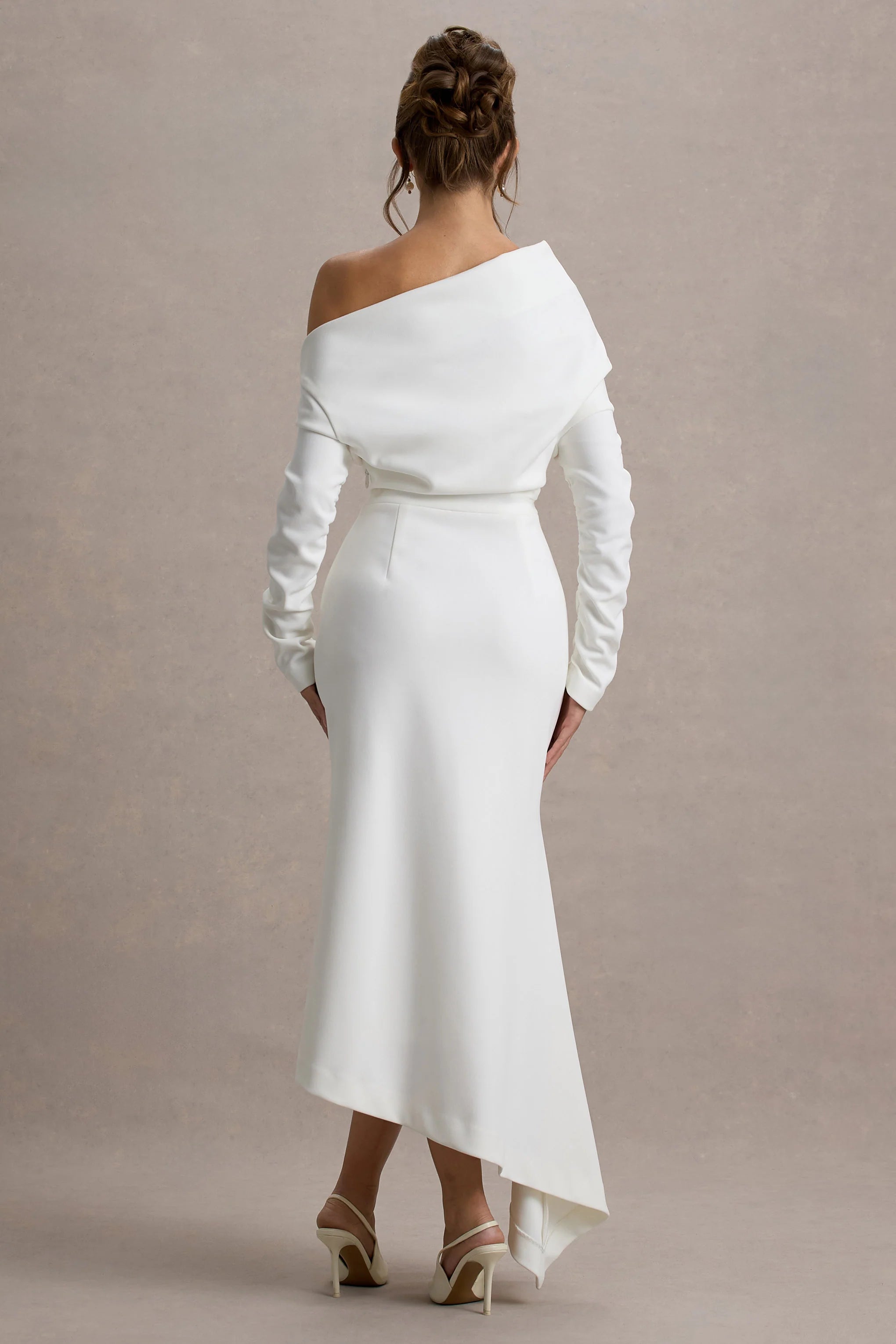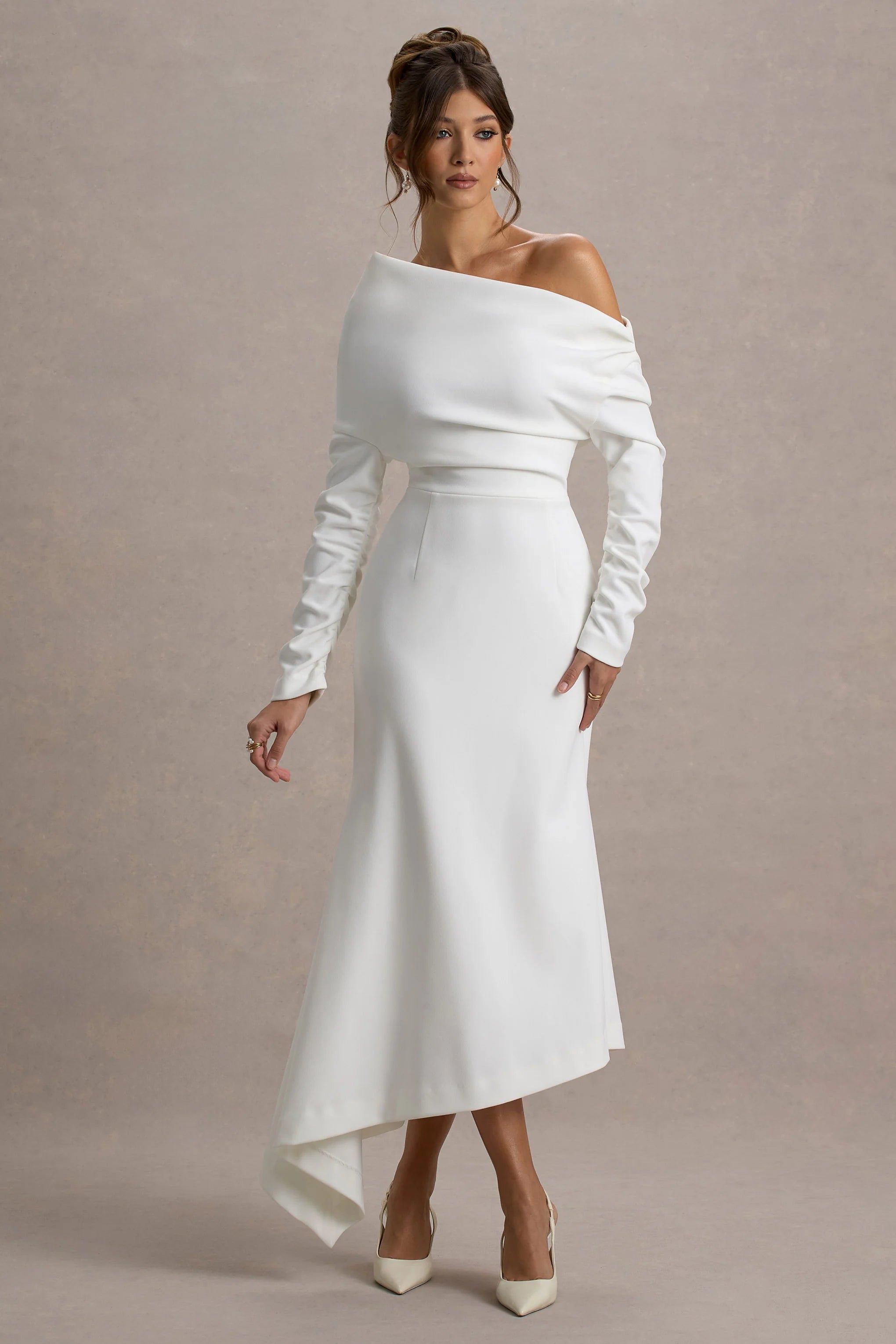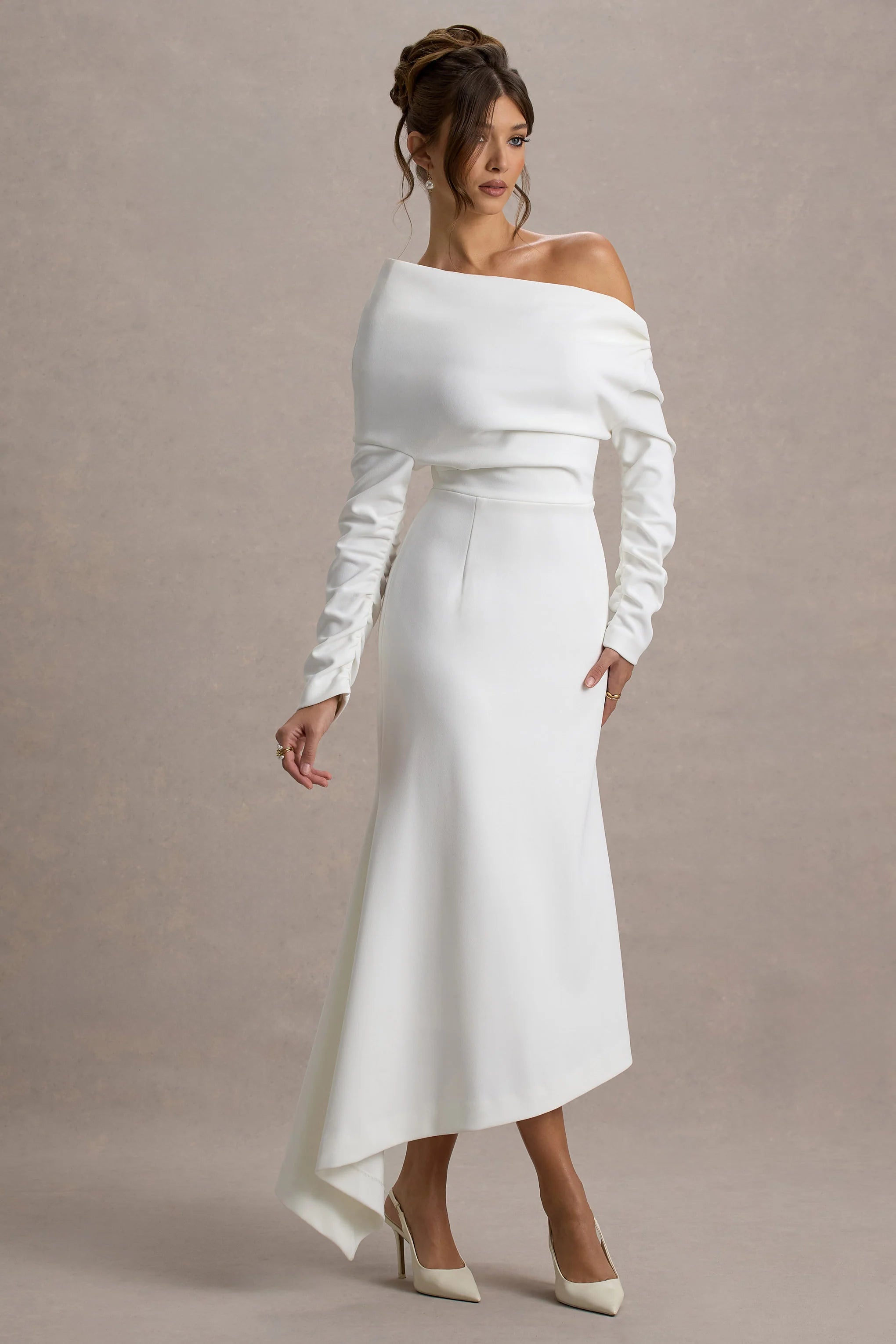 Embrace the wow-factor at every event in our latest white maxi Lou. Presented in a premium crepe, this elegant choice is detailed with a graceful bardot neckline and flouncy asymmetric hemline. Style Lou with a sleek bun for an iconic graduation look.