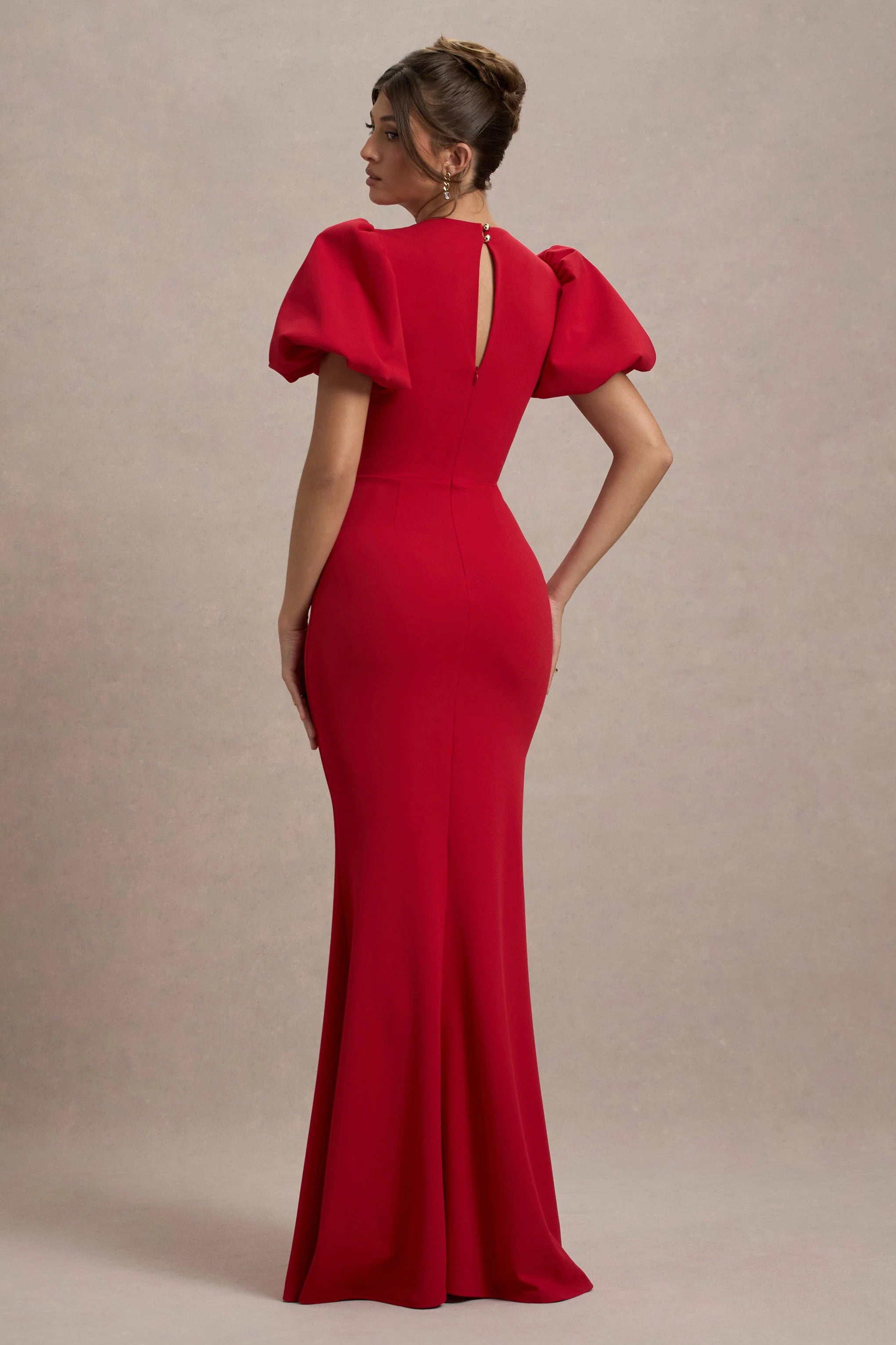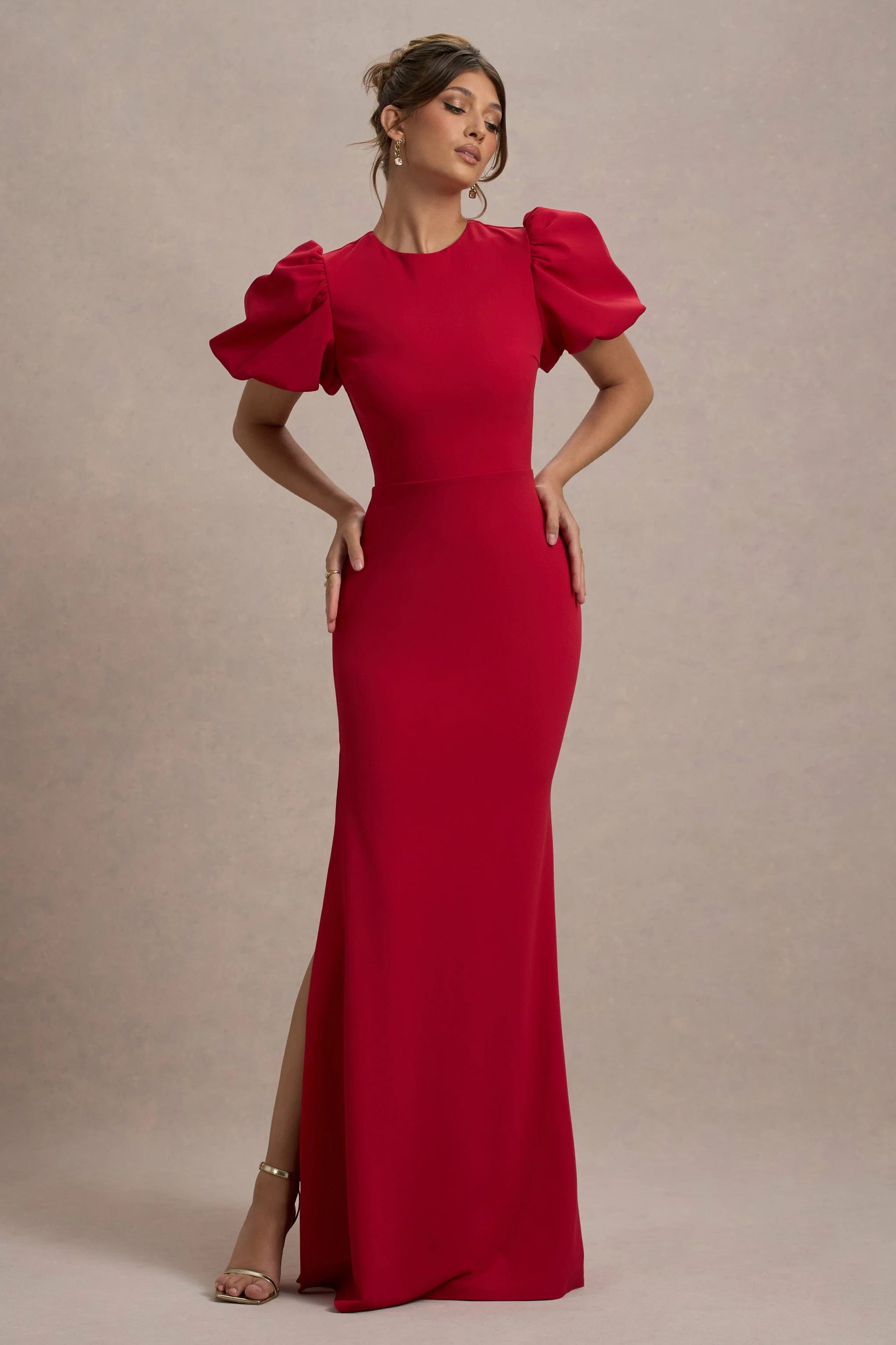 Exude a romantic state of mind in our aptly-named maxi, Love Letters. Crafted in a sultry red shade of our premium scuba crepe, this floor-sweeper boasts artful puff sleeves and a high-leg split. Compliment this occasion maxi by styling yours with some glistening gold accents.