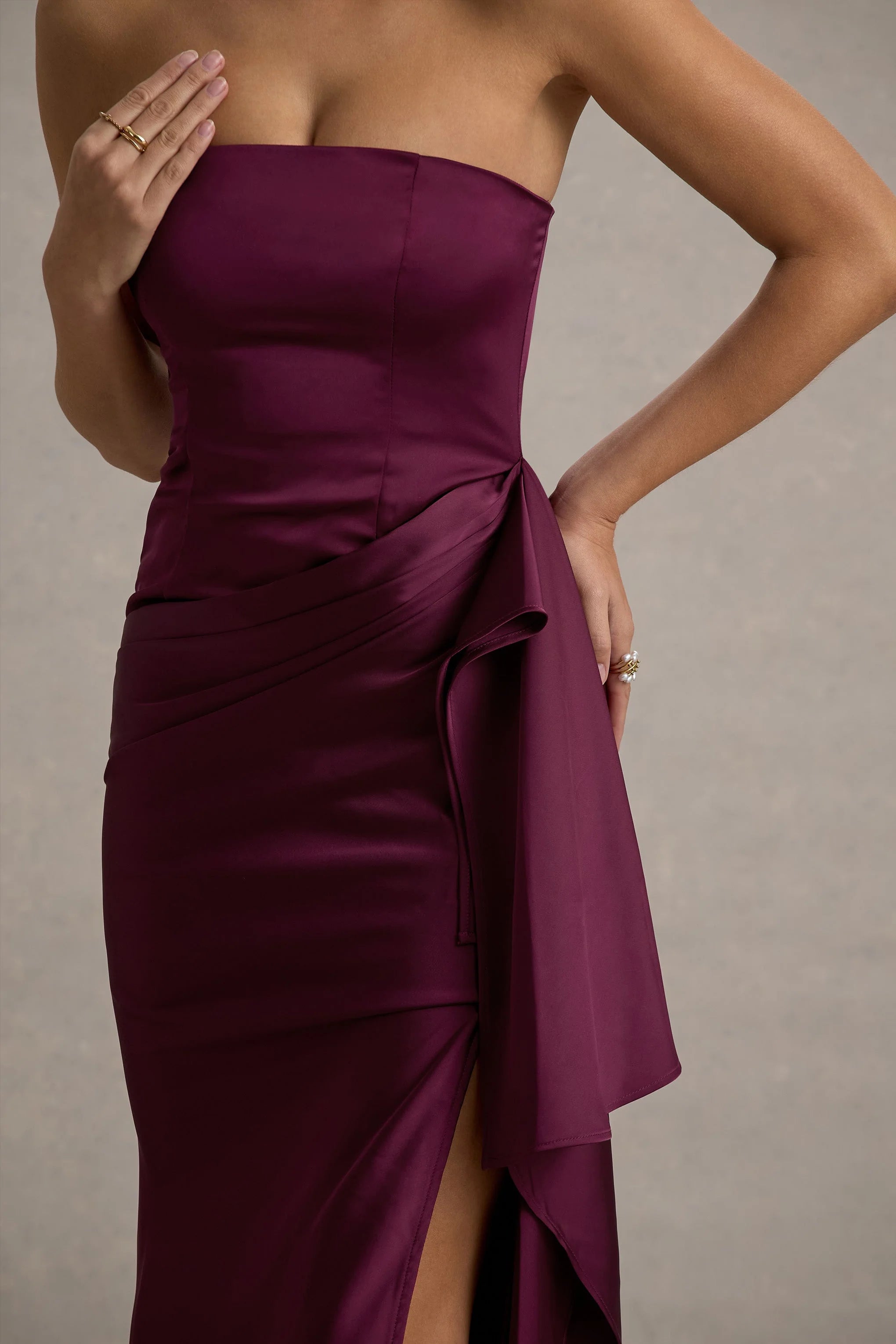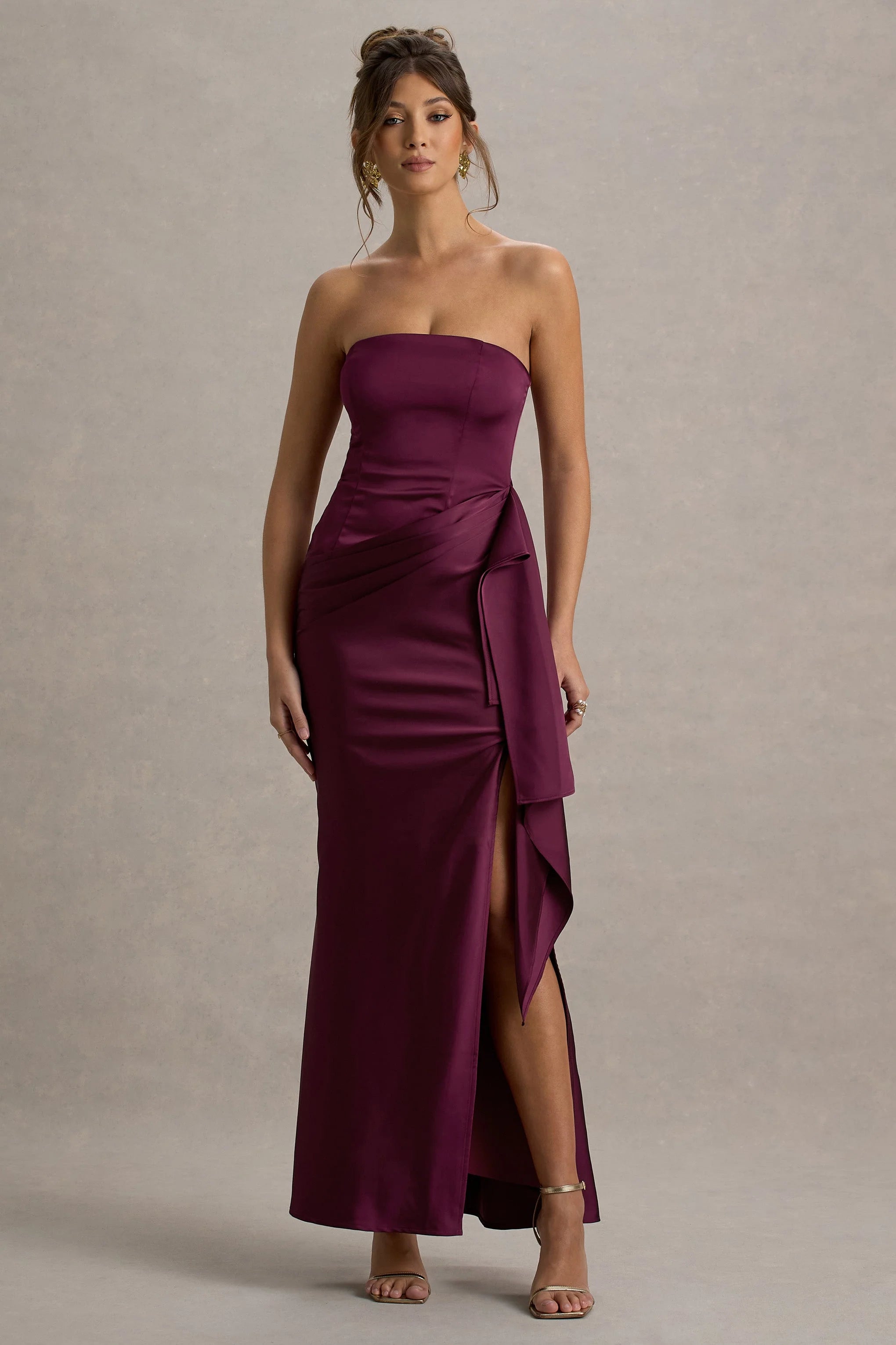 Defined by soft elegance and refined detail, Loz is a stunning choice for your most glamorous occasions. Crafted from our luxurious premium stretch satin in a burgundy hue, this maxi dress features a chic bandeau neckline that beautifully highlights the shoulders. The expertly draped silhouette flatters the figure, while the floor-length skirt adds a touch of timeless sophistication. Trying styling Loz with sparkling accessories for a look that exudes romantic charm.