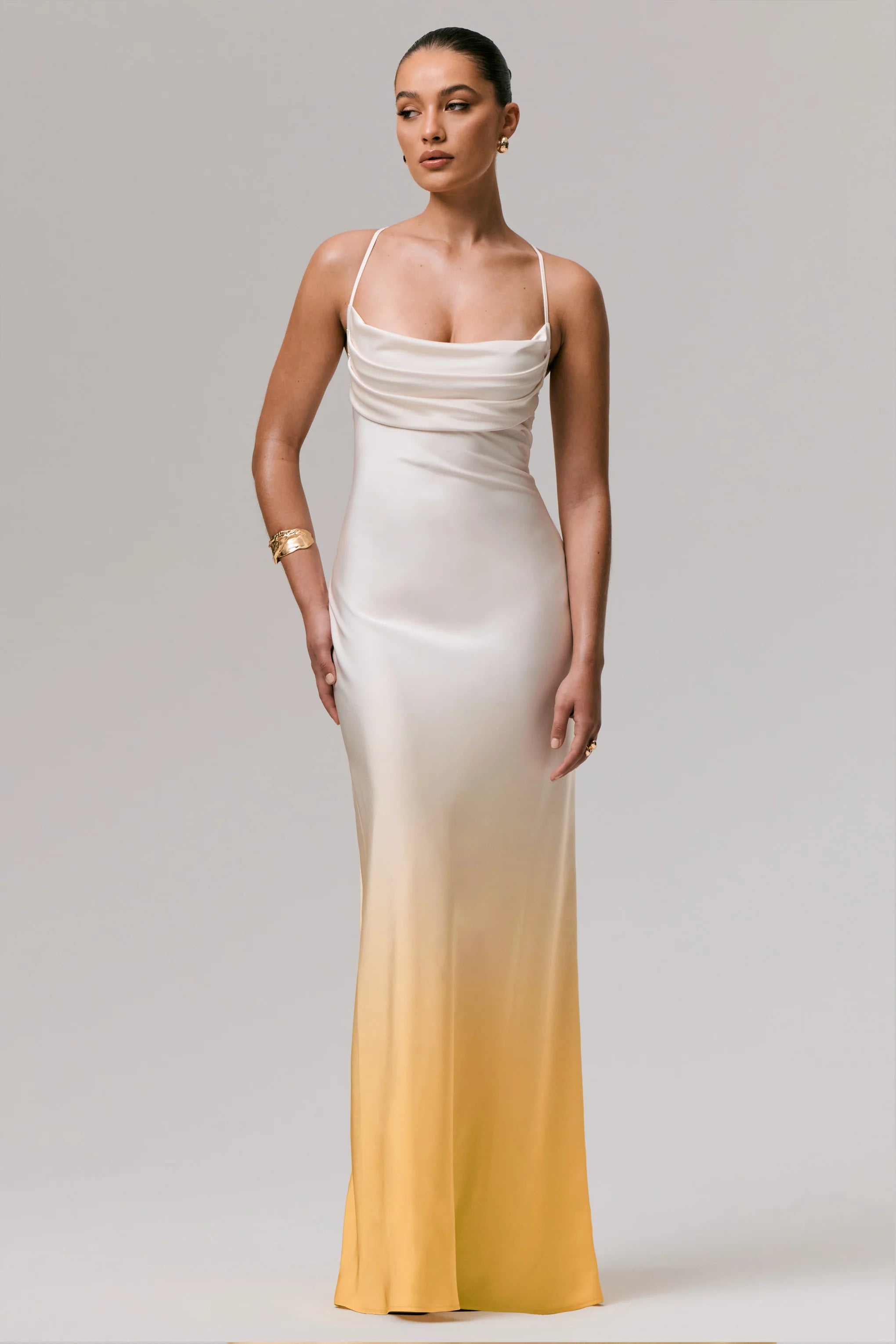 Timeless elegance meets allure in our latest head-turner, Lucie. Crafted in a striking yellow ombre hue of our premium stretch satin, this maxi dress moves effortlessly whilst defining your silhouette. The draped cowl neckline adds an effortless feel to this show-stopper, whilst elegantly displaying your decolletage. Finished with a head-turning tie up back detail, that drops into a V-shape, providing a perfect fit that cinches your figure to perfection. Dress this style up, for black-tie moments, or pair with sandals and beachy waves for sunset cocktails.
