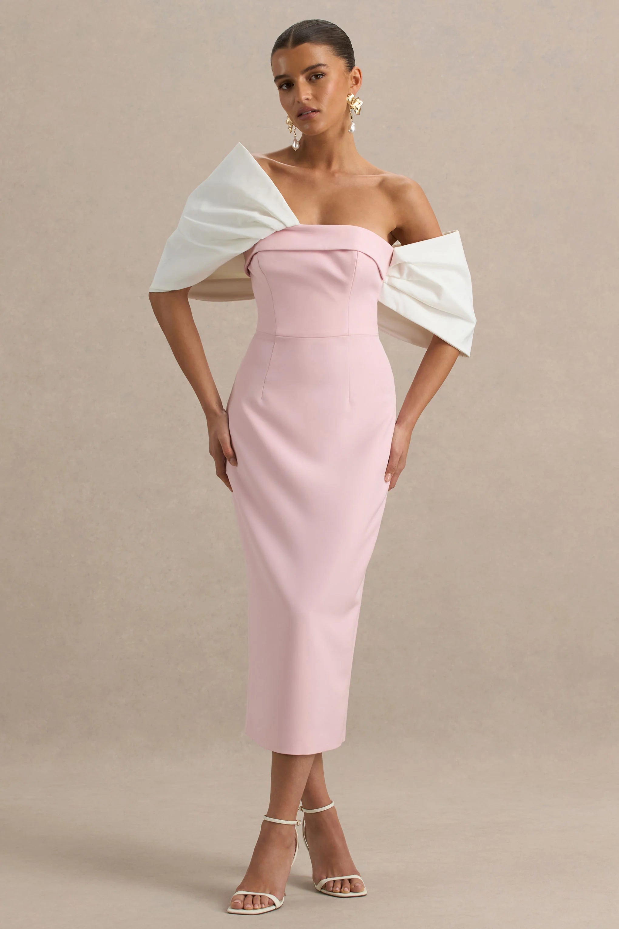 Bold and unforgettable, Lucille is designed to turn heads. This midi is cut from our premium, sculpting stretch crepe in a bold rose pink shade and is finished with delicate, white satin sleeves that exudes elegance. Featuring a bardot, bow neckline and completed with draped off-shoulder sleeves for an ultra-feminine feel. With a sleek fit, this dress flatters you from all angles. Perfect for evening dinners and black tie moments, paired with sleek heels and a chic up-do.