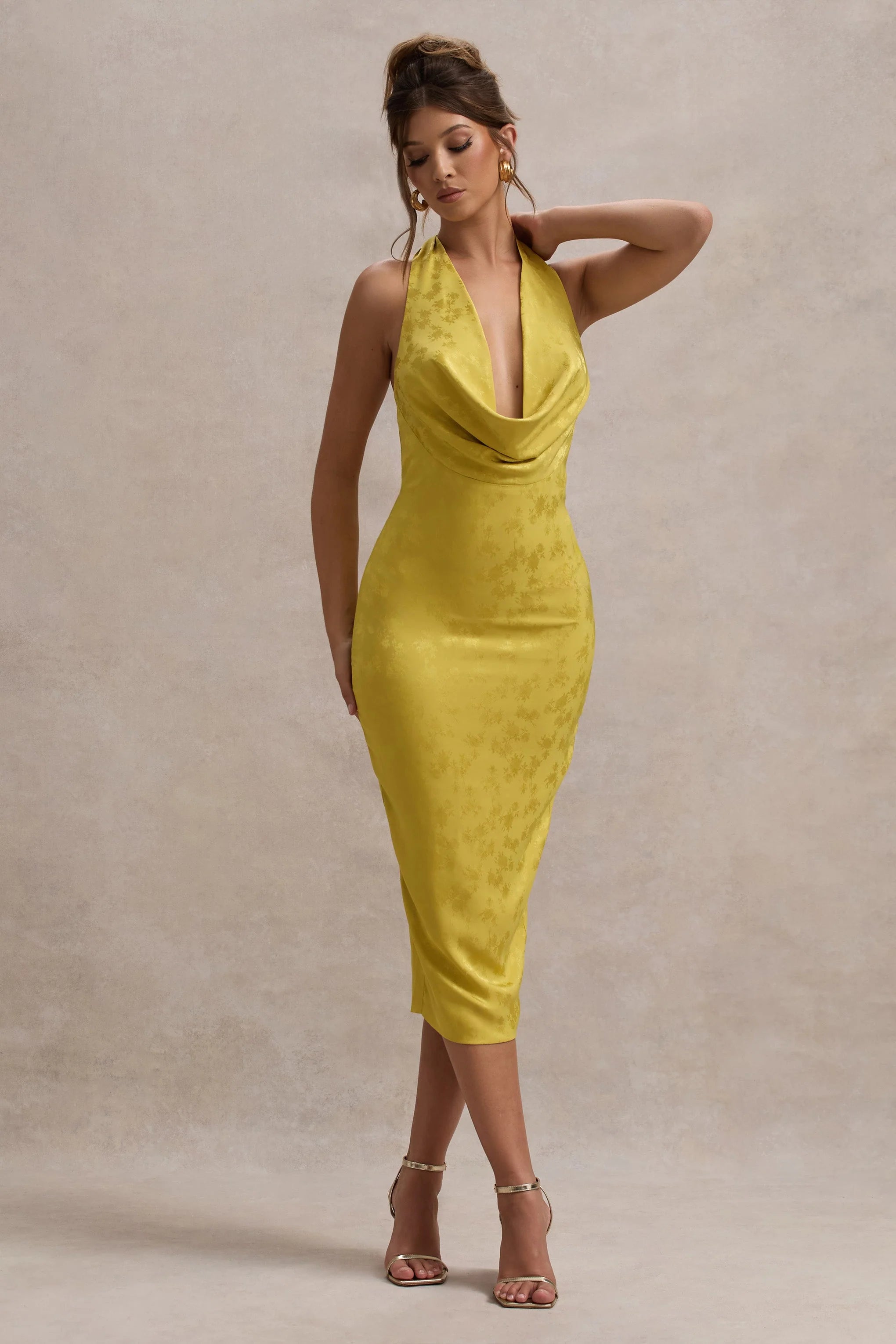 Elevate your wardrobe with our statement midi Maciza. Arriving in our premium mustard satin jacquard, the flattering cowl neck and midi length create an elegant silhouette perfect for any occasion. For extra comfort, pair yours with our Boomba Body Tape to keep you on the dancefloor all night long.