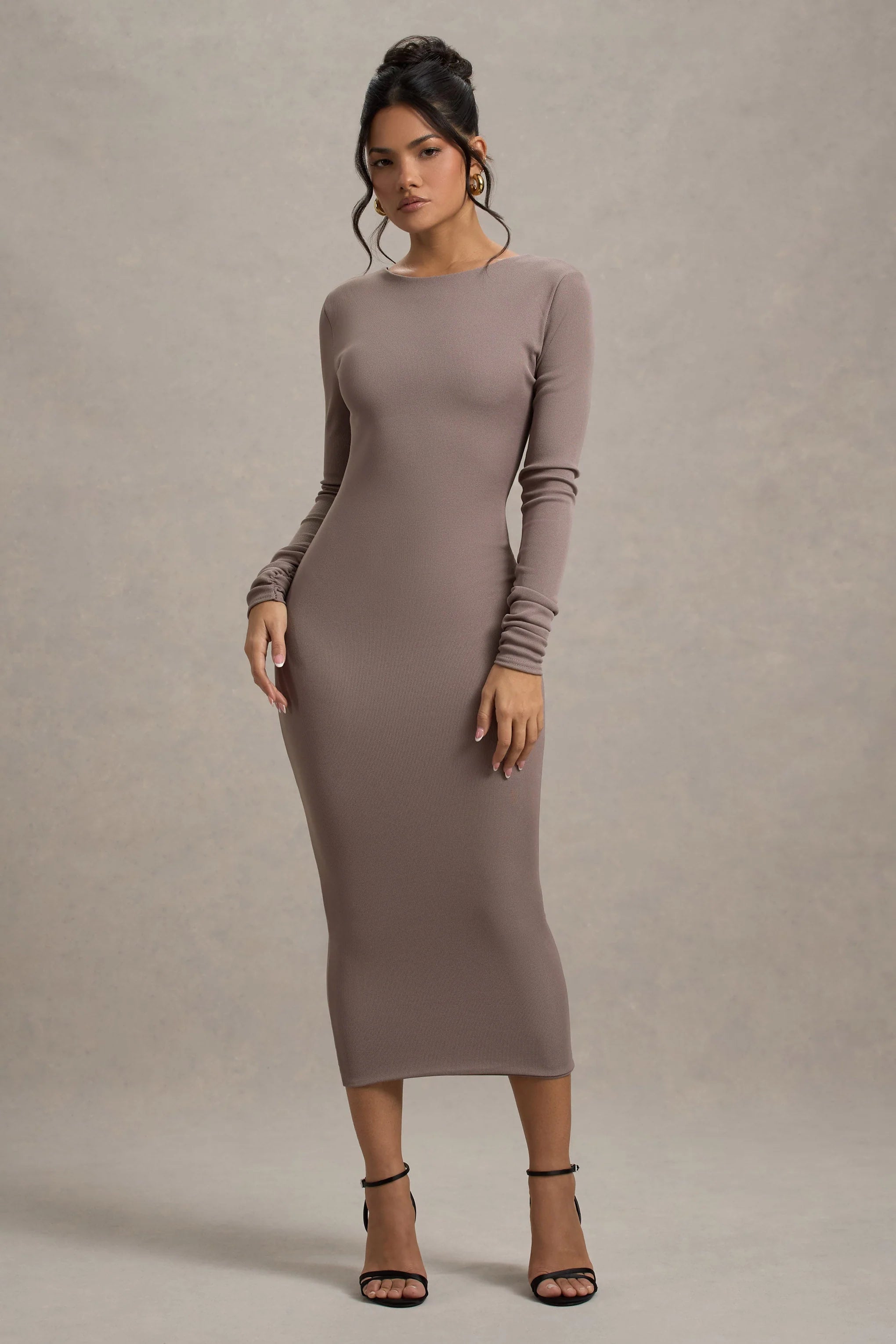 A fashion constant, Madden elevates any wardrobe its added to. Crafted in a soft knitted fabric, this taupe midi dress is defined by a contemporary cowl back and sculpting bodycon silhouette. For an elegant date night look, team yours with a tousled bun to show off all Madden has to offer.