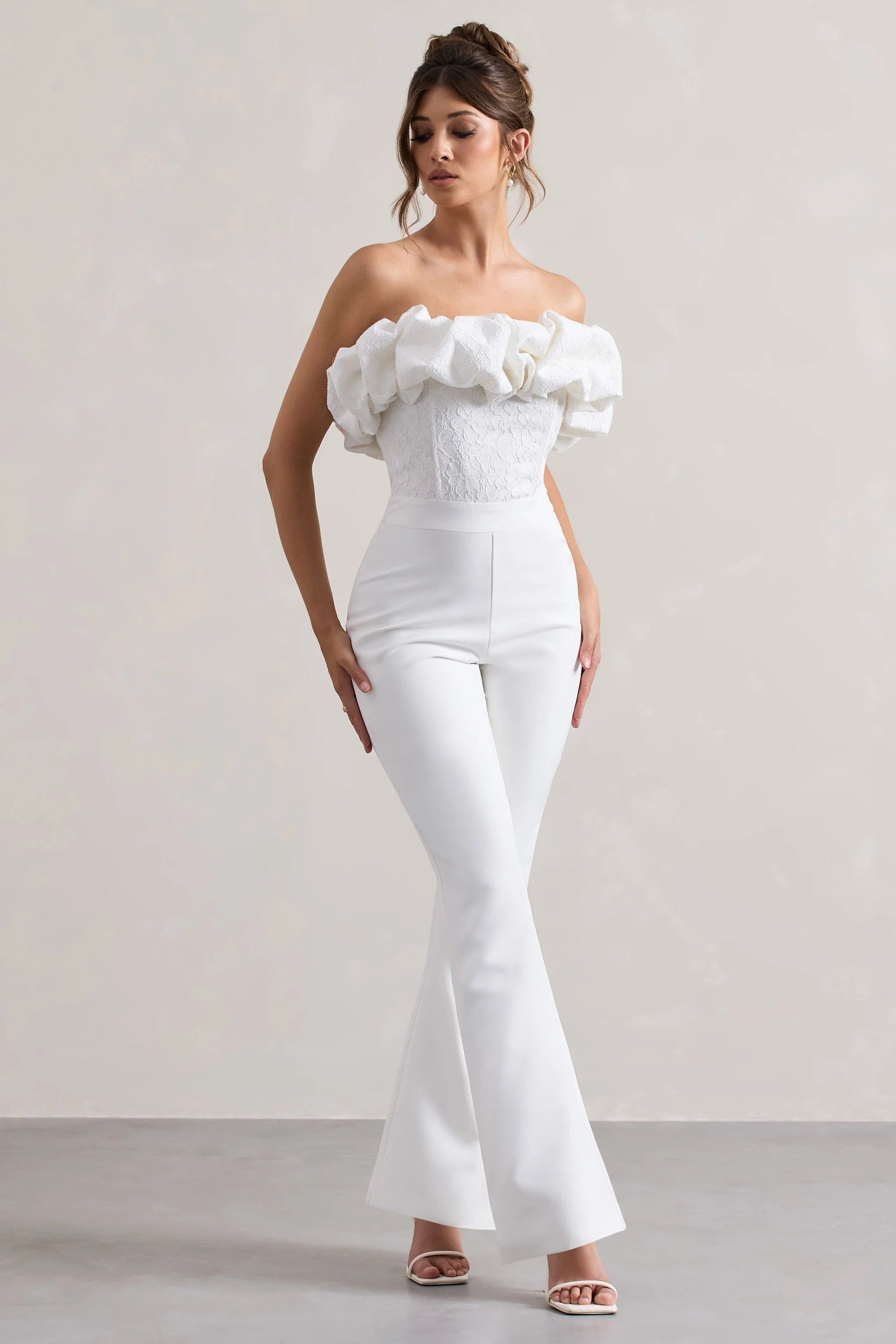 With multiple elevated details that bring the drama, Maddox is the ultimate event piece. Defined by an elegant lace bodice, this white jumpsuit features an artful ruffle neckline and flattering flared legs. Show off all this show-stopper has to offer by styling yours with a sleek bun and gold hoop earrings.