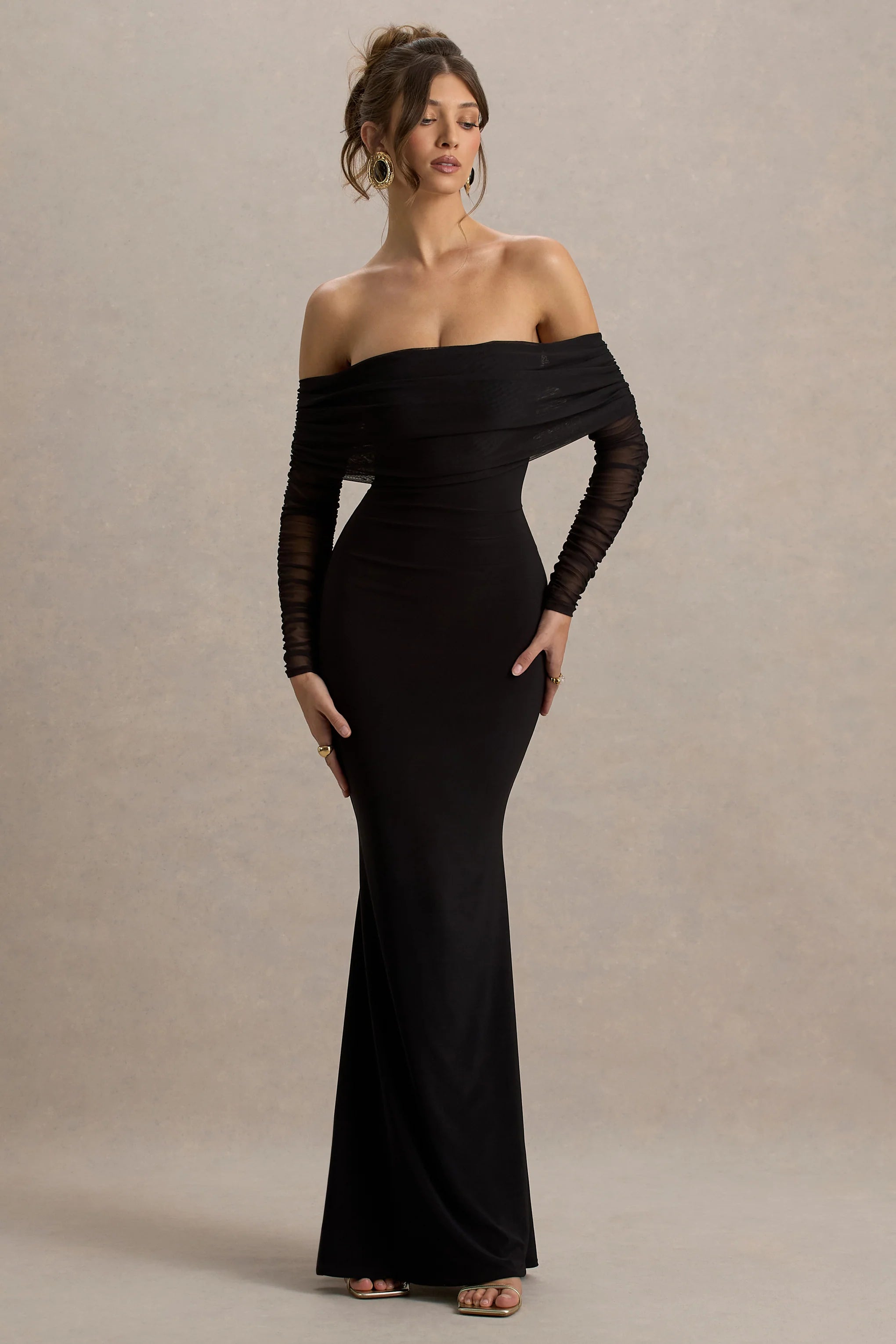 Meet Madeleine, a beloved silhouette from the Club L archives reintroduced in our premium black jersey with a Bardot neckline wrapped by flattering ruching. Complementing this bodice are long mesh sleeves whilst a floor-length fishtail skirt guarantees you make a memorable entrance at any formal event from weddings to grand engagements.
