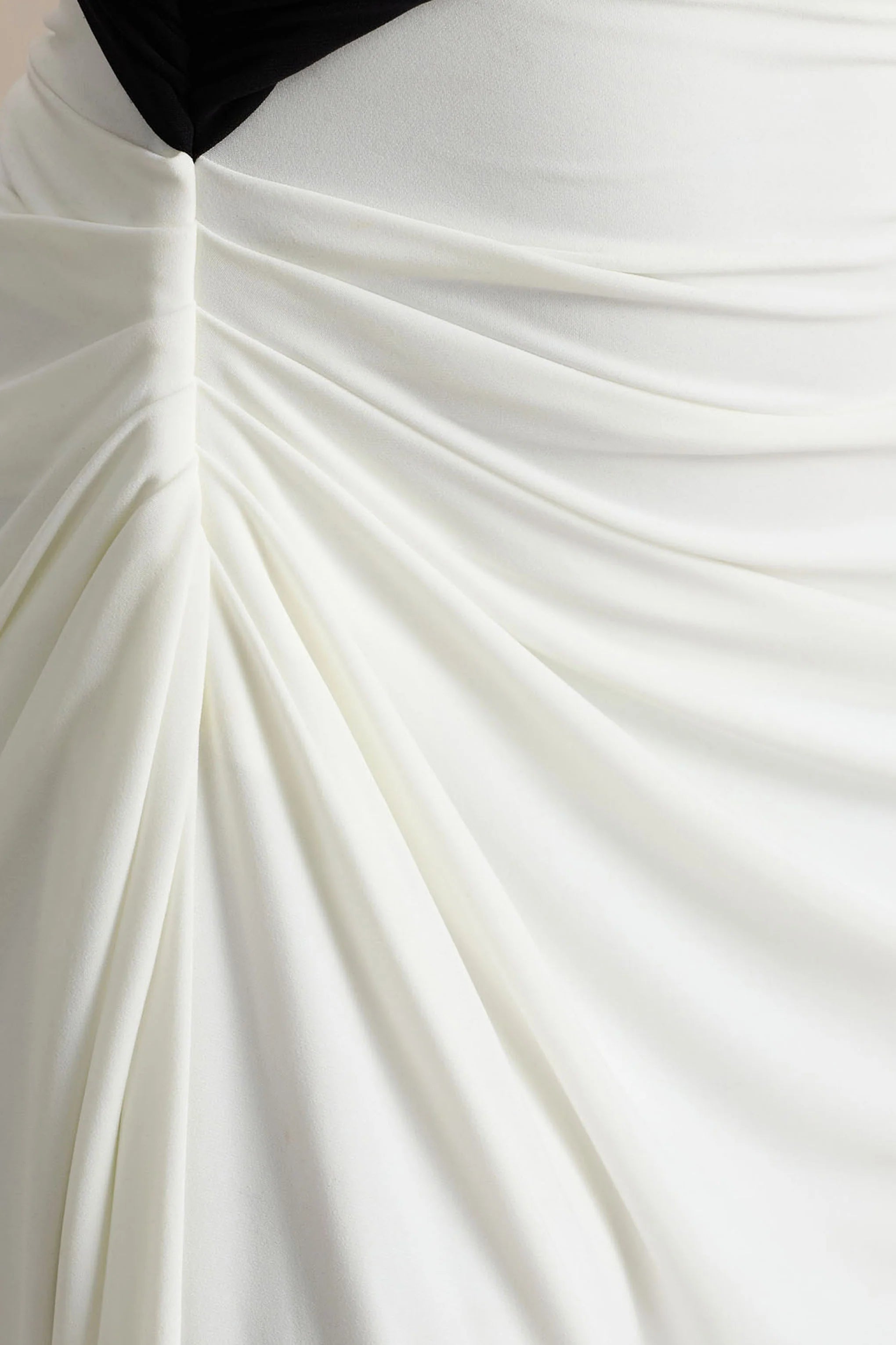 Own the spotlight in Malika, a statement maxi made for after-dark drama. Crafted from our premium stretch jersey in striking black and white hues, this silhouette contours the body beautifully, enhancing your shape with every curve. Designed with a bold asymmetric neckline and daring cut-out, Malika delivers high-impact style with ruched detailing that flatters from every angle. A true power piece for unforgettable nights.