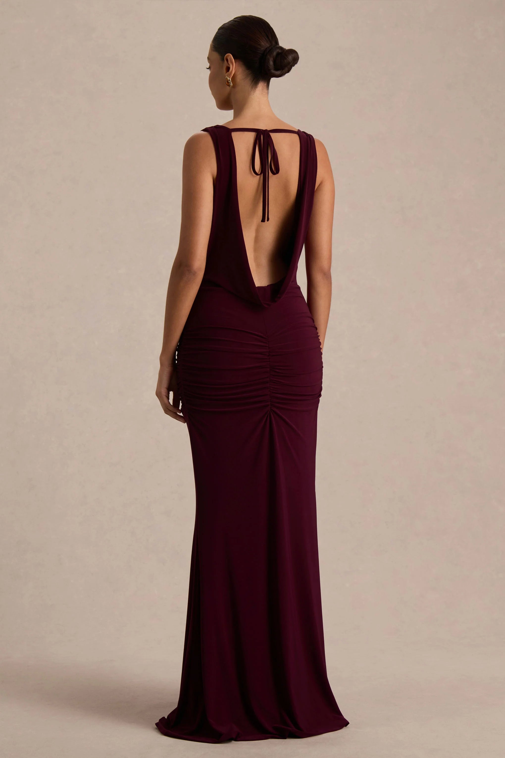 Mallie is elegance with a daring twist, made to leave a lasting impression. Cut from our premium burgundy stretch jersey, this maxi dress smooths and flatters with a body-skimming silhouette. The draped cowl neckline flows into an open back with a delicate tie detail, striking the perfect balance of sophistication and allure. Gathered detailing and a sash accentuate the waist, ensuring you are flattered from all angles. Mallie is pure evening glamour, designed for unforgettable nights.