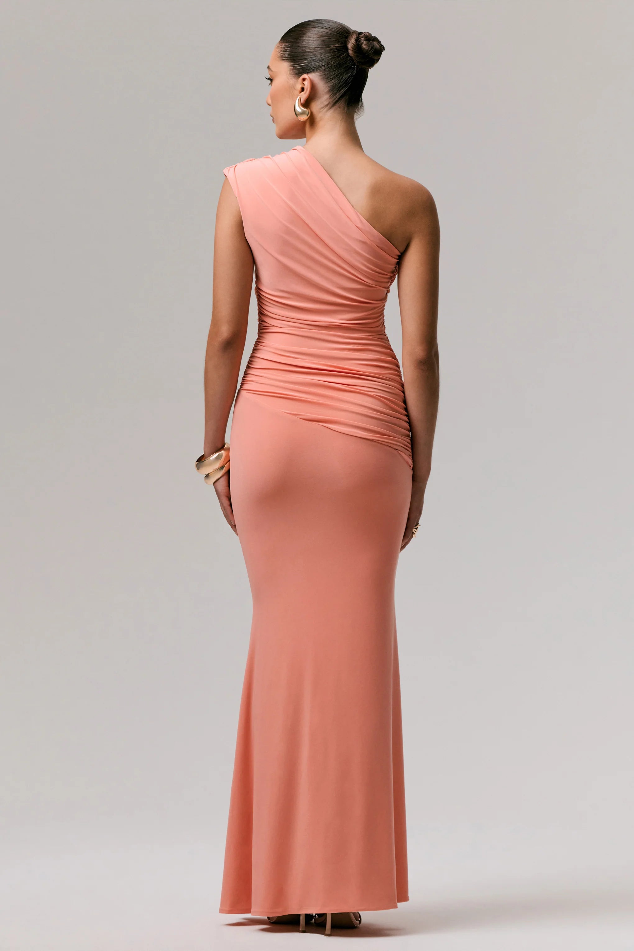 Own the room in Mardi, a sculpting silhouette made to flatter. Crafted in our premium stretch jersey, in this coral hued maxi you will make an entrance. Designed with a modern, asymmetric neckline that delicately displays your decolletage whilst adding chic structure. Finished with expertly placed ruched detailing, for the ultimate figure flattering finish, in this gown you will look sleek and sculpted. Pair with luxe heels and a glamorous up-do to finish the look.